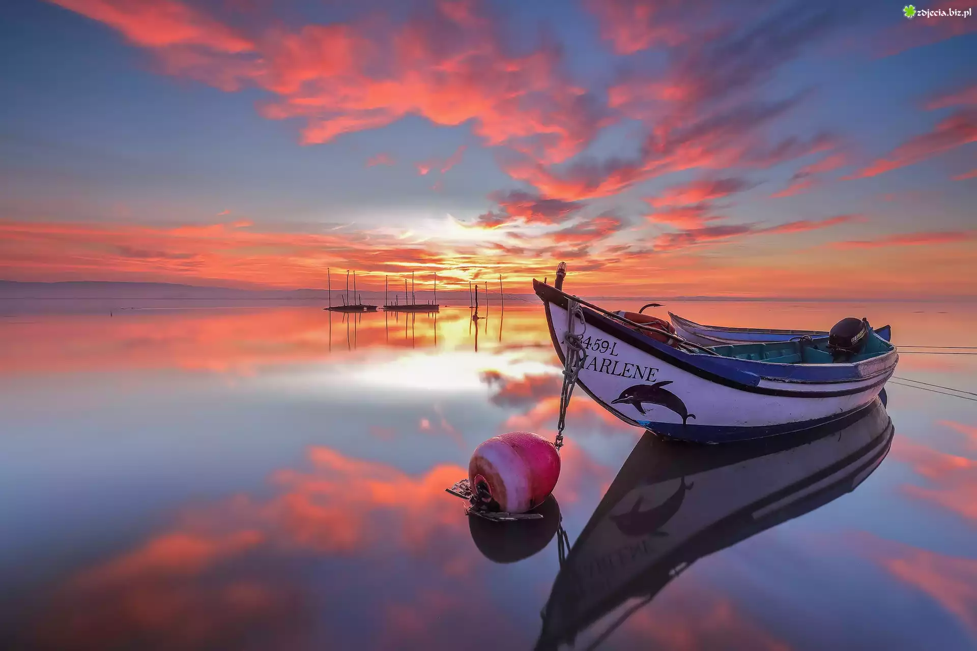 Zdjęcie Łódka, Jezioro, Niebo, Chmury, Odbicie, Wschód słońca