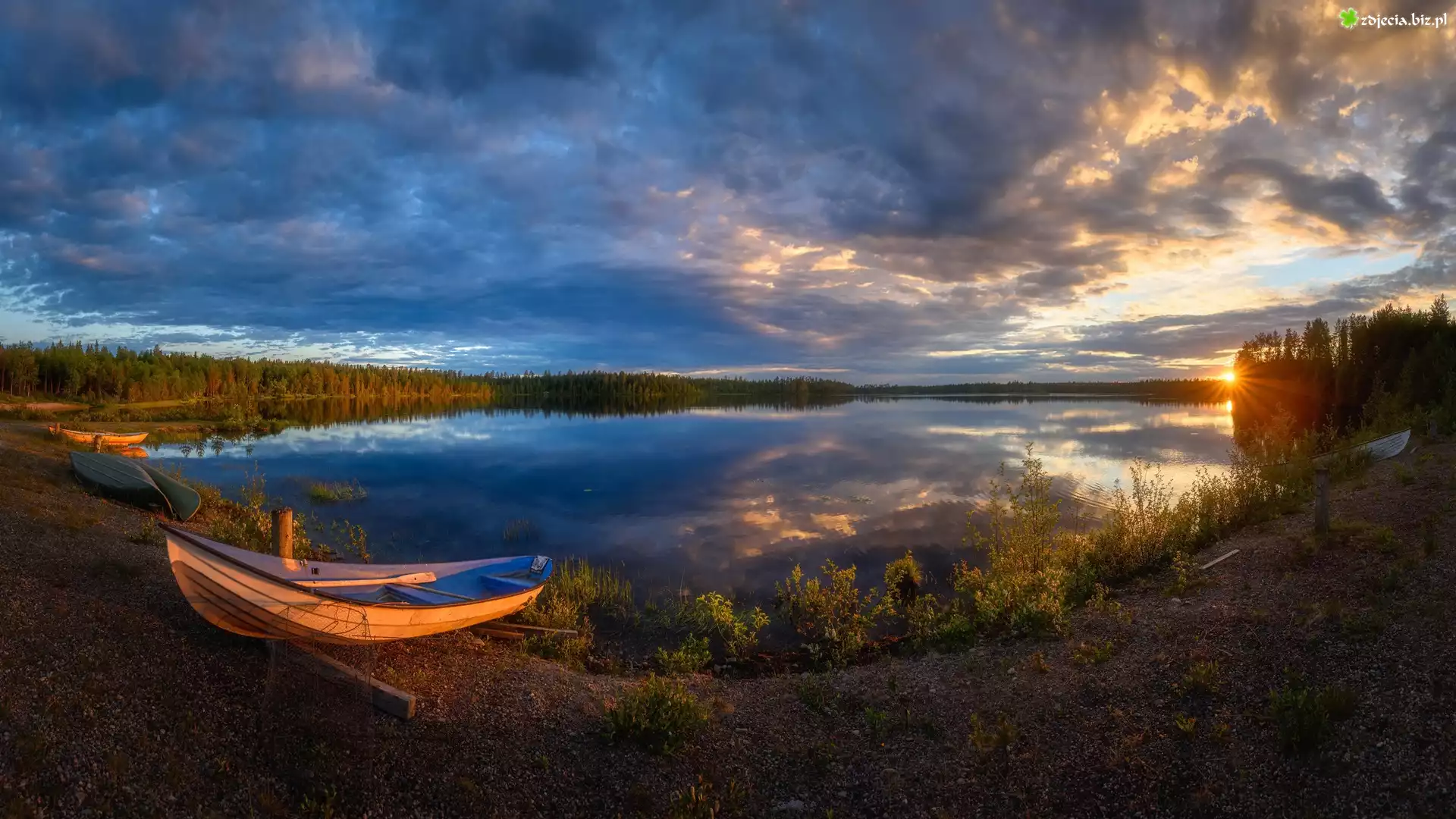 Zdjęcie Jezioro, Łódki, Las, Drzewa, Promienie słońca, Chmury