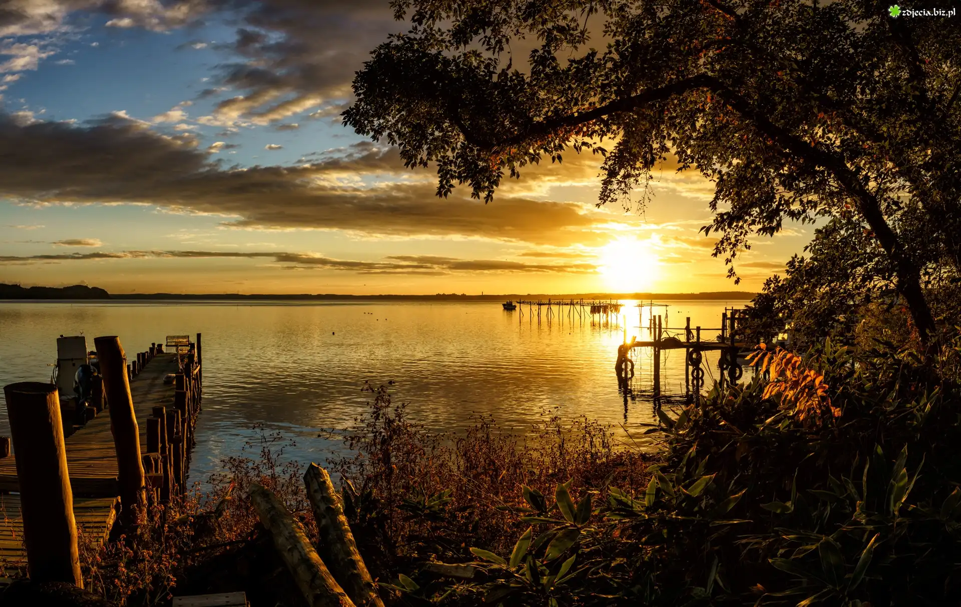 Zdjęcie, Jezioro Ogawara, Pomost, Drzewa, Wschód słońca, Aomori, Japonia
