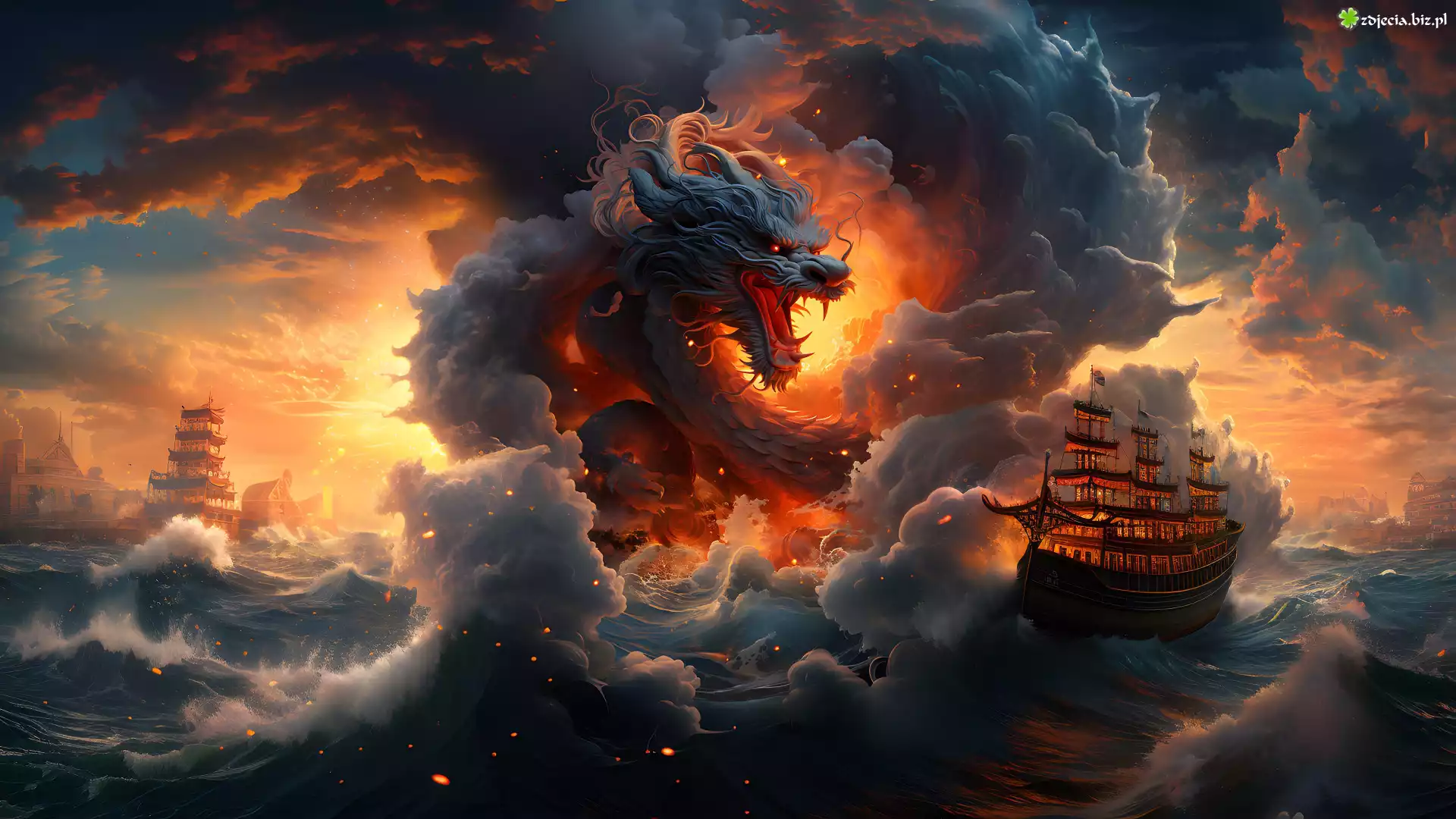 Zdjęcie Morze, Żaglowiec, Chmury, Ogień, Smok, Fantasy