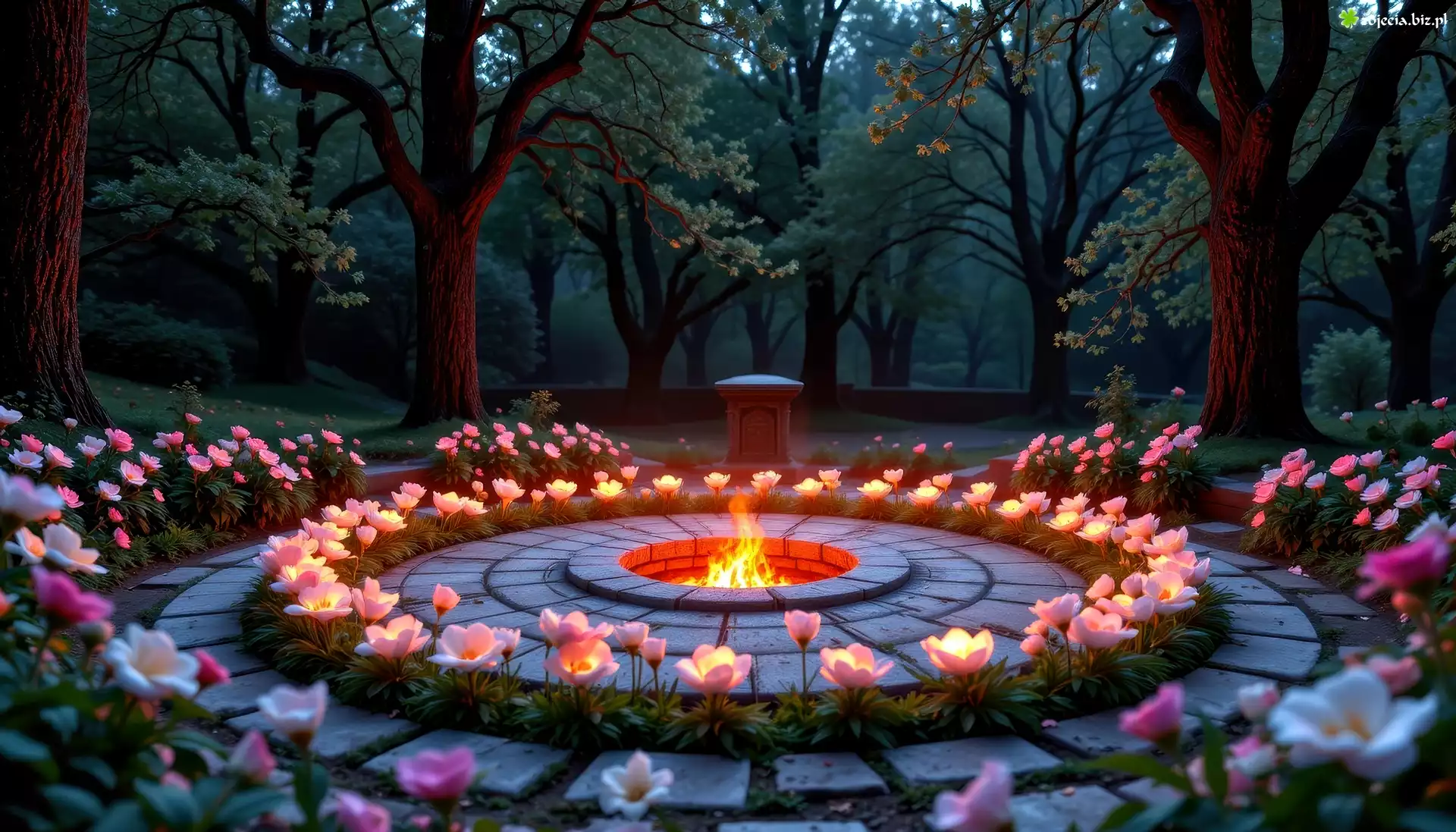Zdjęcie Kamienny, Krąg, Kwiaty, Ogień, Drzewa, Grafika AI