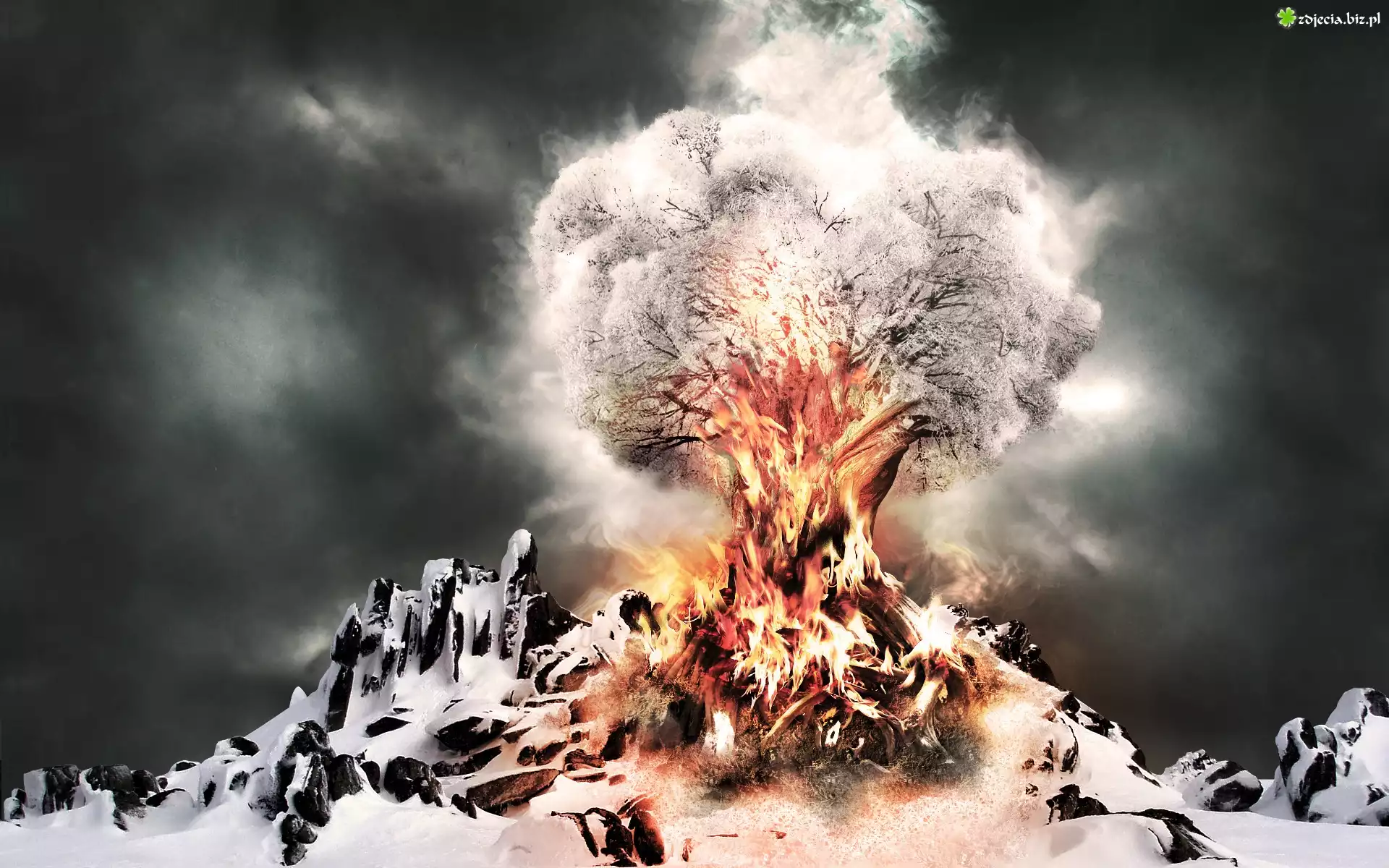 Zdjęcie Ogniste, Drzewo, Skały, Śnieg