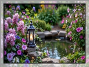 Zdjęcie Kwiaty, Lampion, Sadzawka, Ogród, Grafika AI
