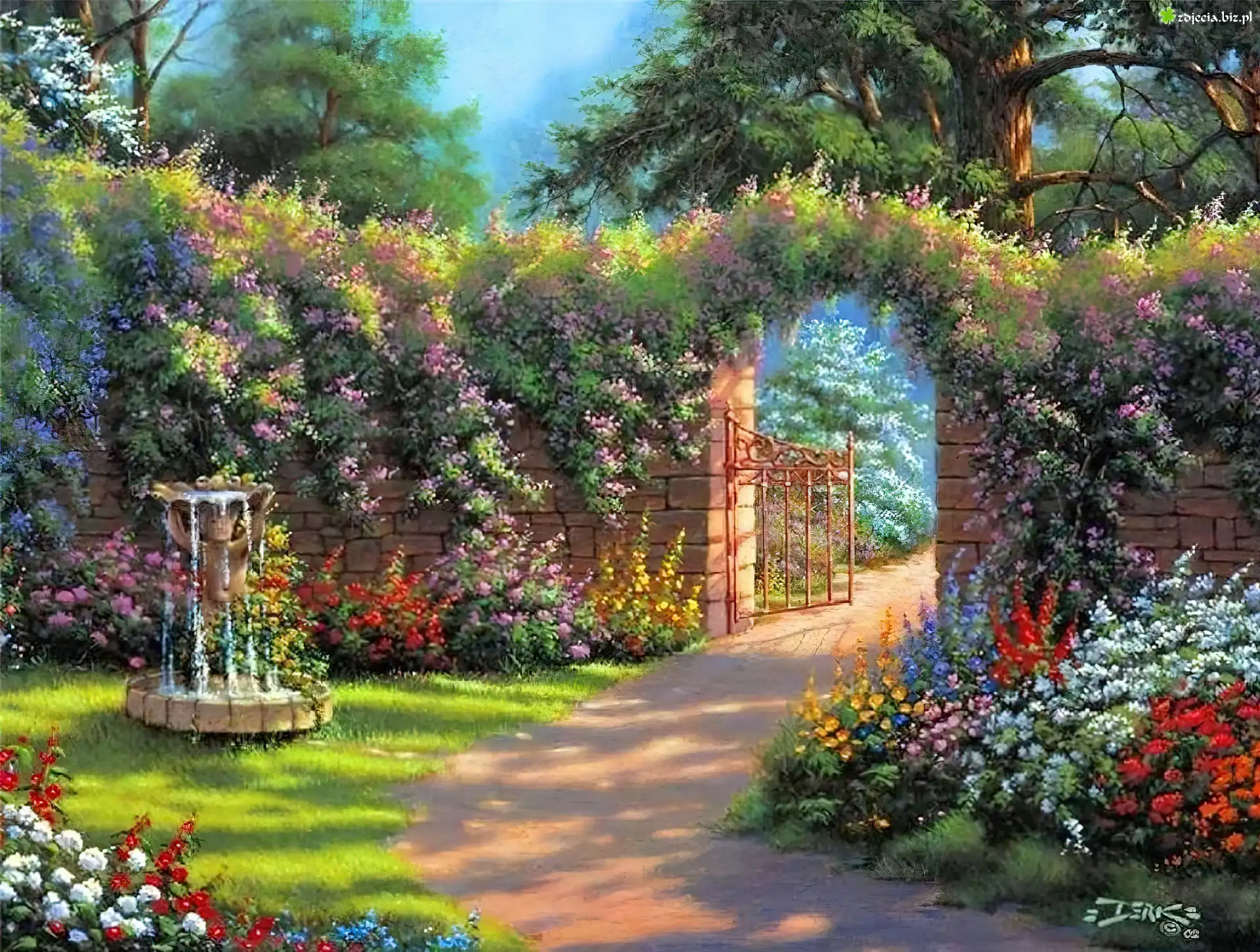 Zdjęcie Ogród, Mur, Brama, Kwiaty