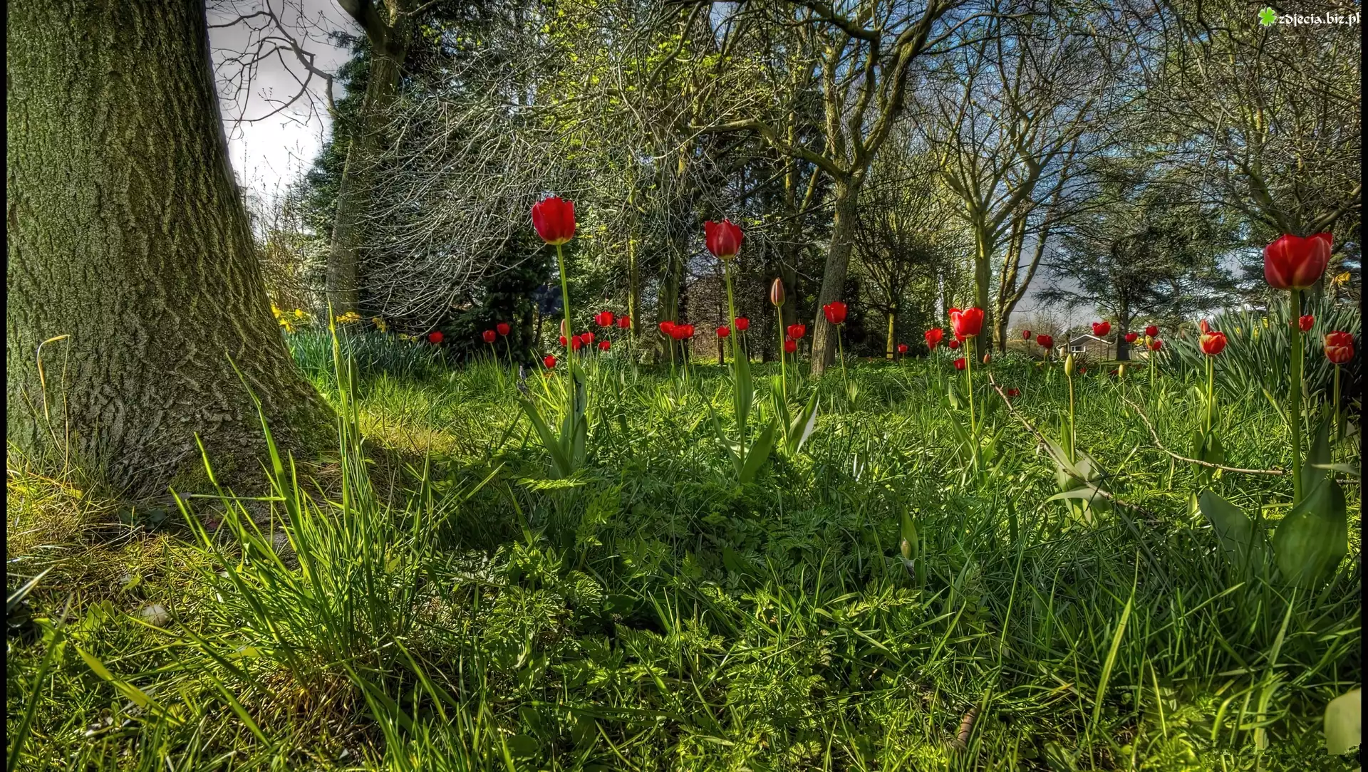 Zdjęcie Ogród, Drzewa, Trawy, Czerwone, Tulipany