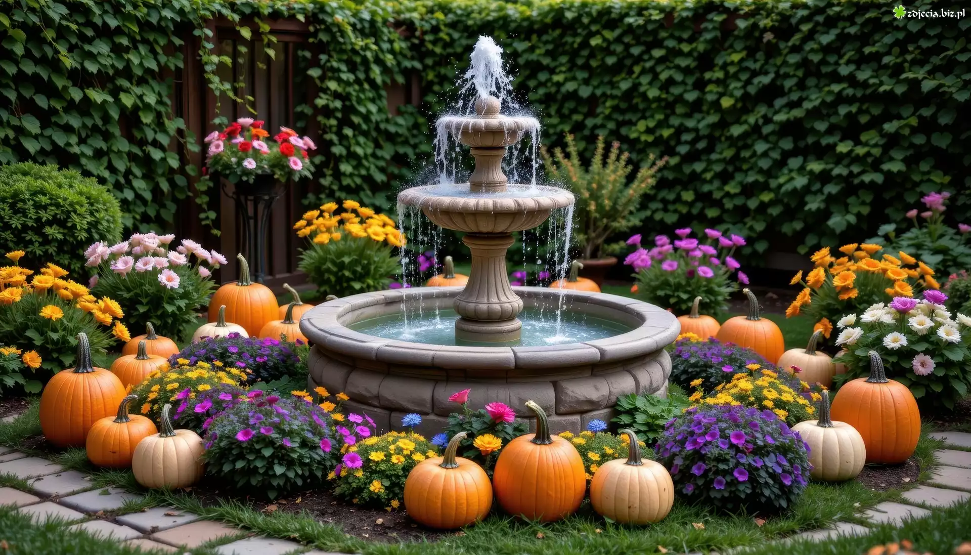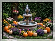 Zdjęcie Dynie, Kwiaty, Fontanna, Ogród