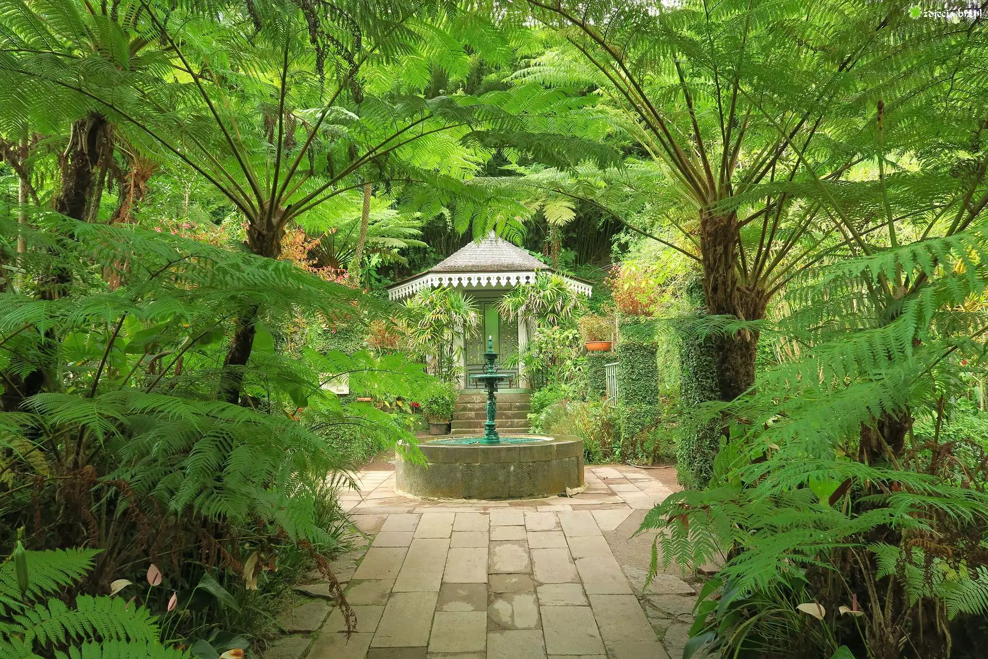 Zdjęcie Fontanna, Palmy, Paprocie, Ogród