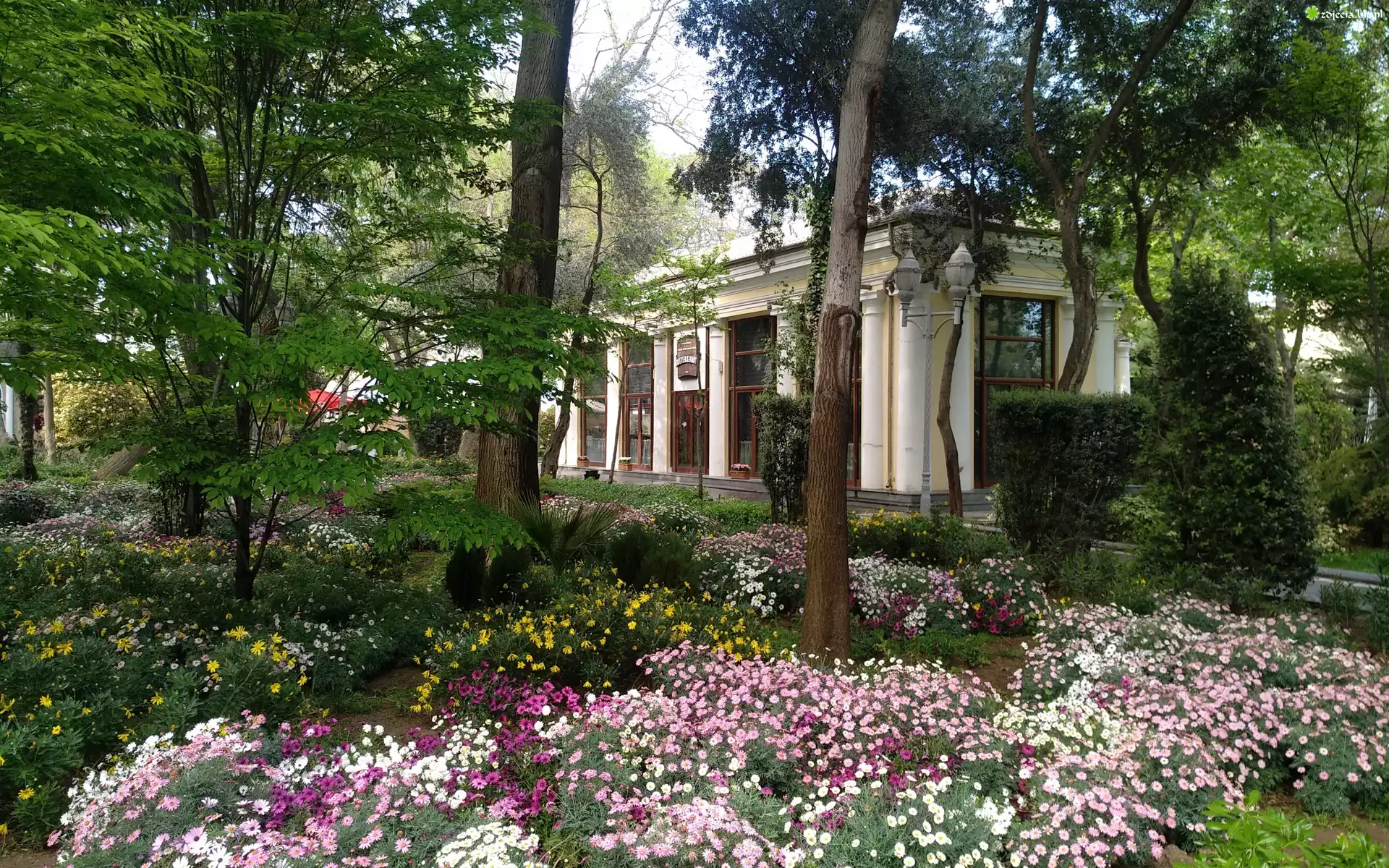 Zdjęcie Ogród, Dom, Kwiaty, Drzewa