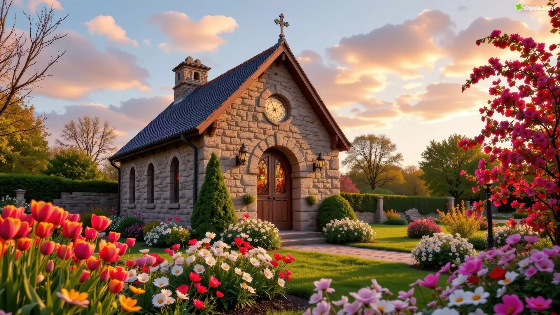 Zdjęcie Kościół, Ogród, Kwiaty, Tulipany, Drzewa