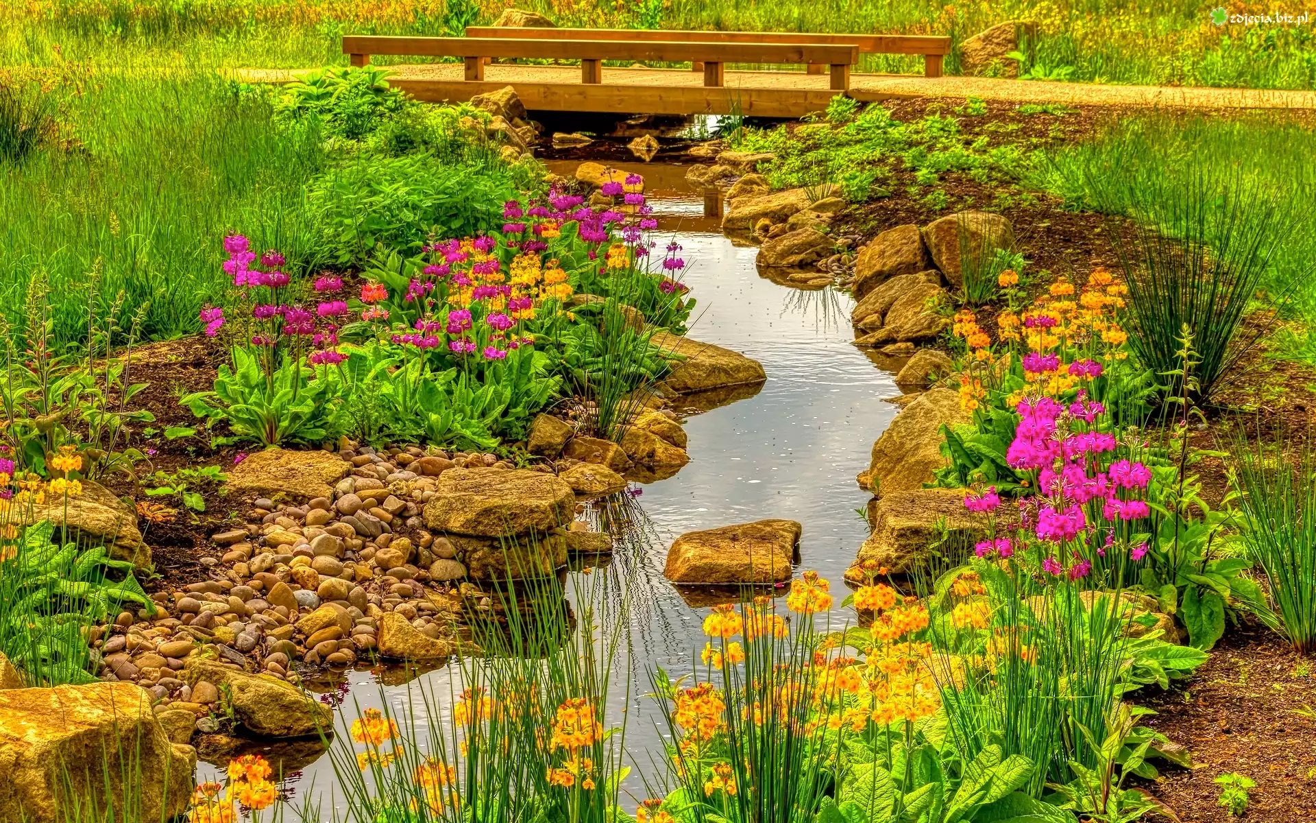 Zdjęcie Ogród, Potok, Mostek, Kamienie, Kwiaty, Rośliny