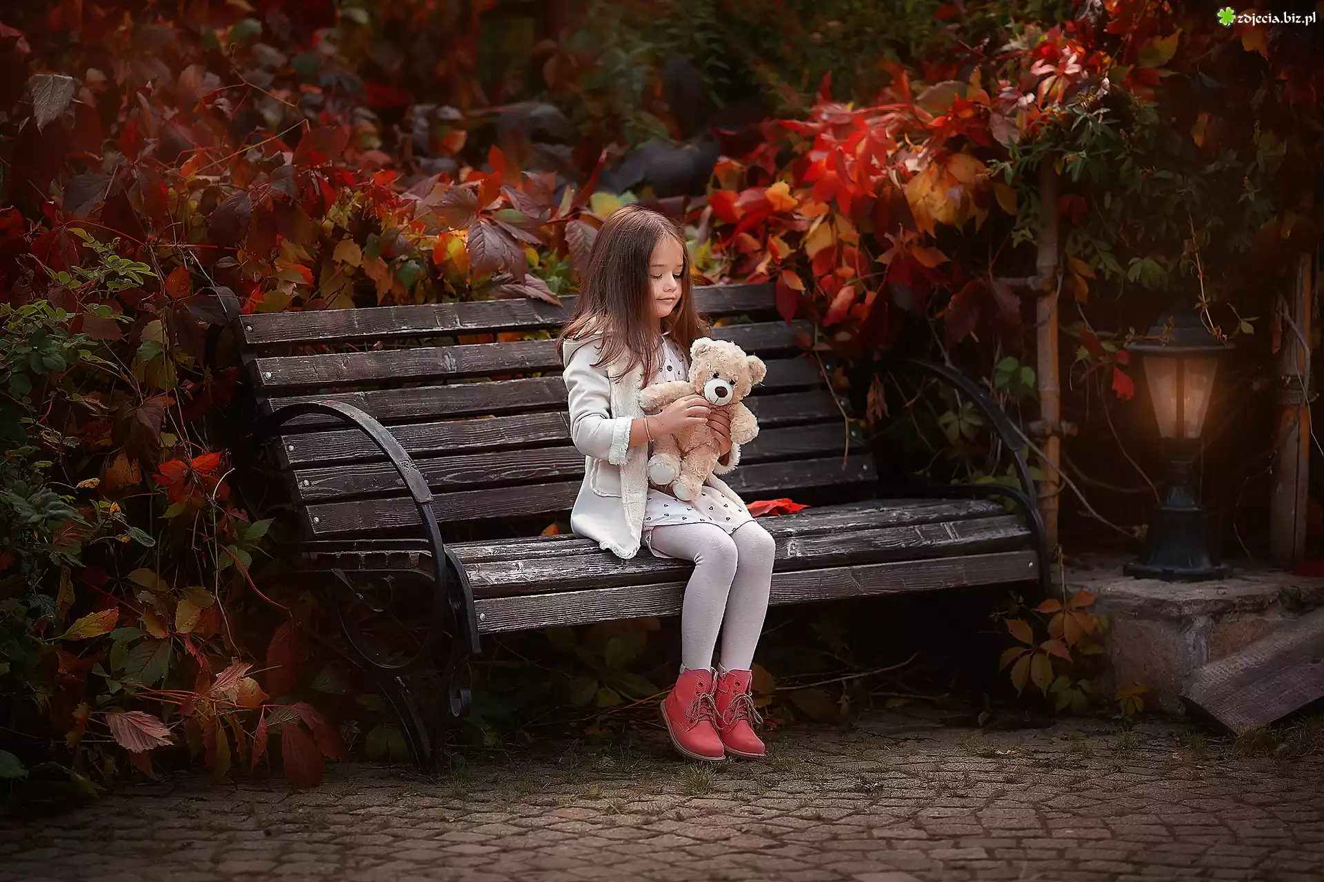 Zdjęcie Jesień, Ogród, Pnącza, Winobluszcz, Ławka, Dziewczynka, Miś, Latarnia
