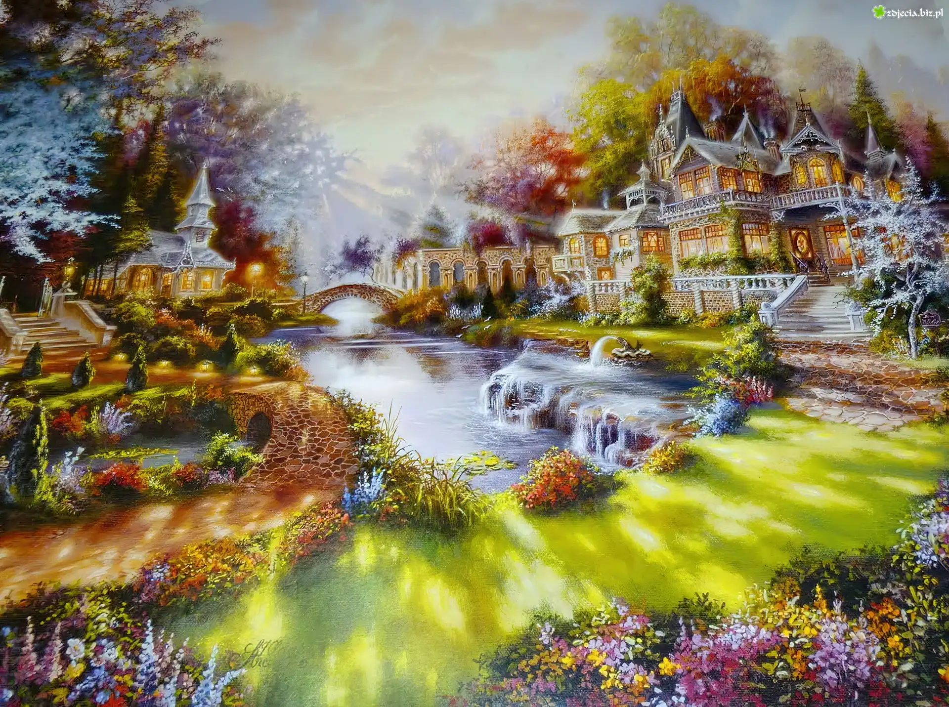 Zdjęcie Ogród, Domy, Mostek, Kwiaty