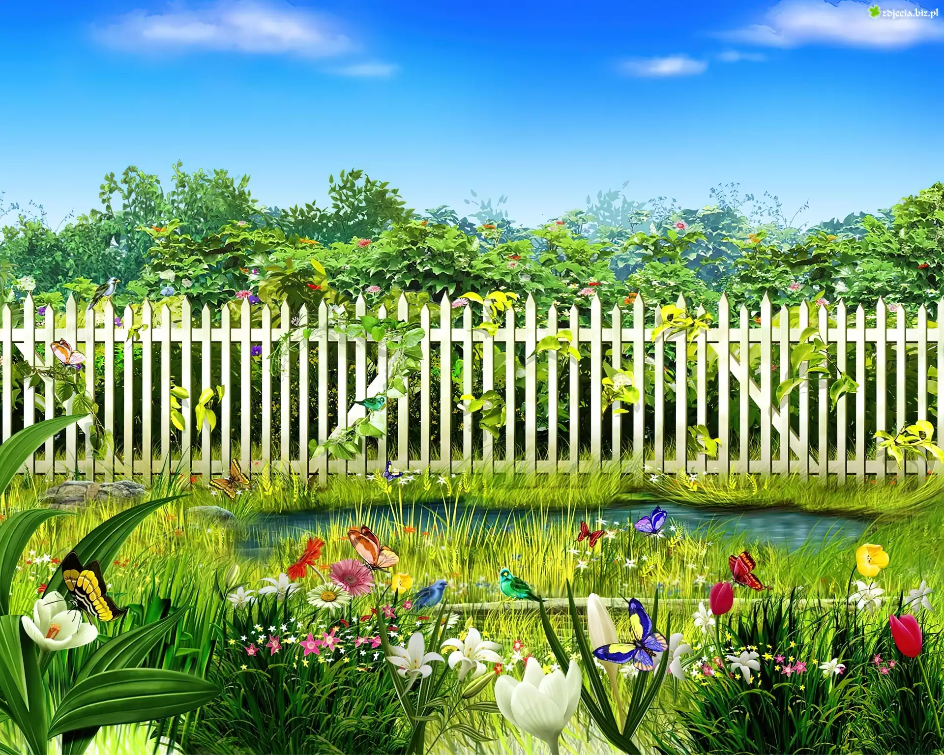 Zdjęcie Ogród, Kwiaty, Bajorko, Motyle, Ptaki, Płot