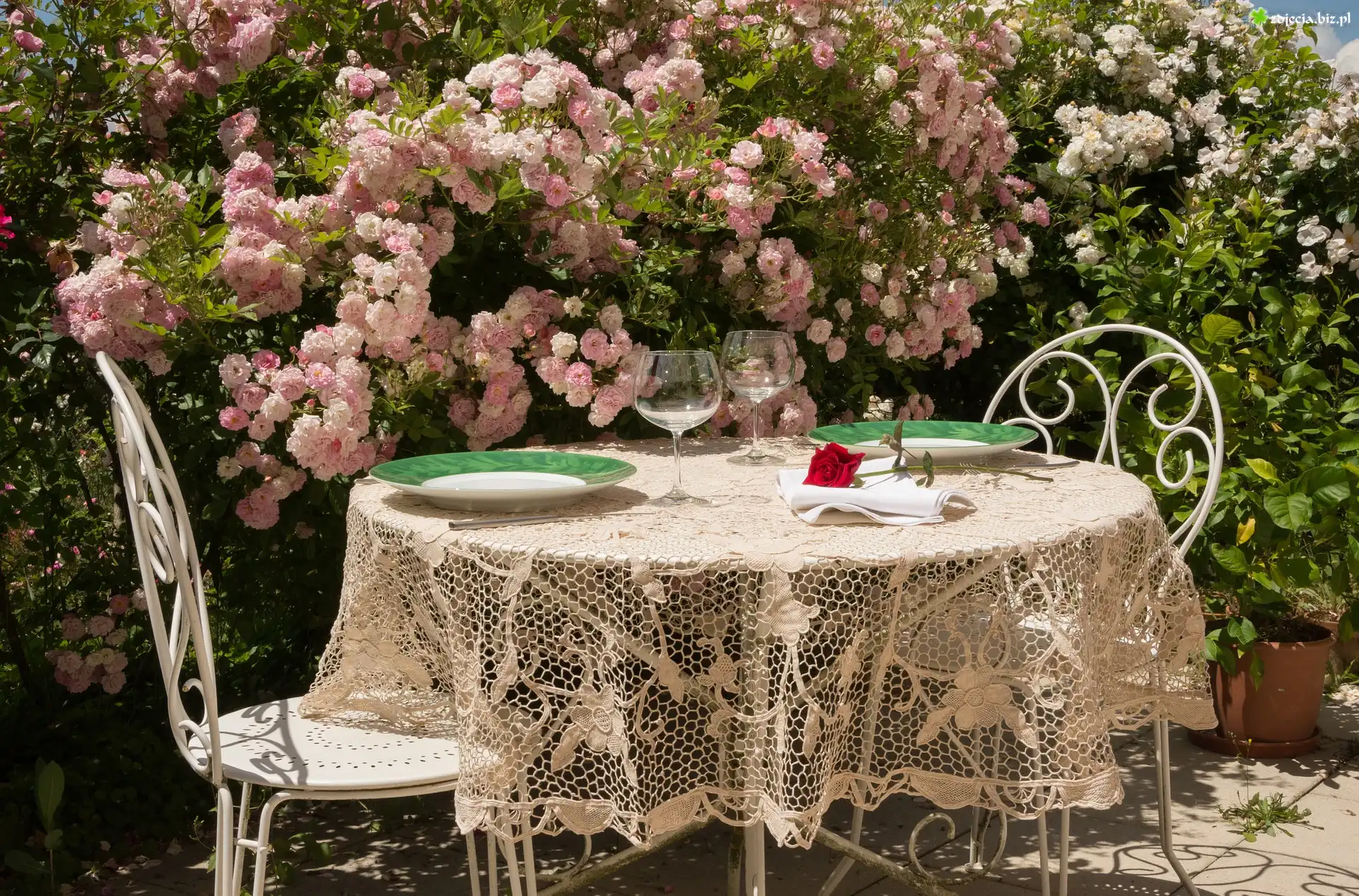 Zdjęcie Ogród, Taras, Stół, Krzesła, Róże, Krzewy
