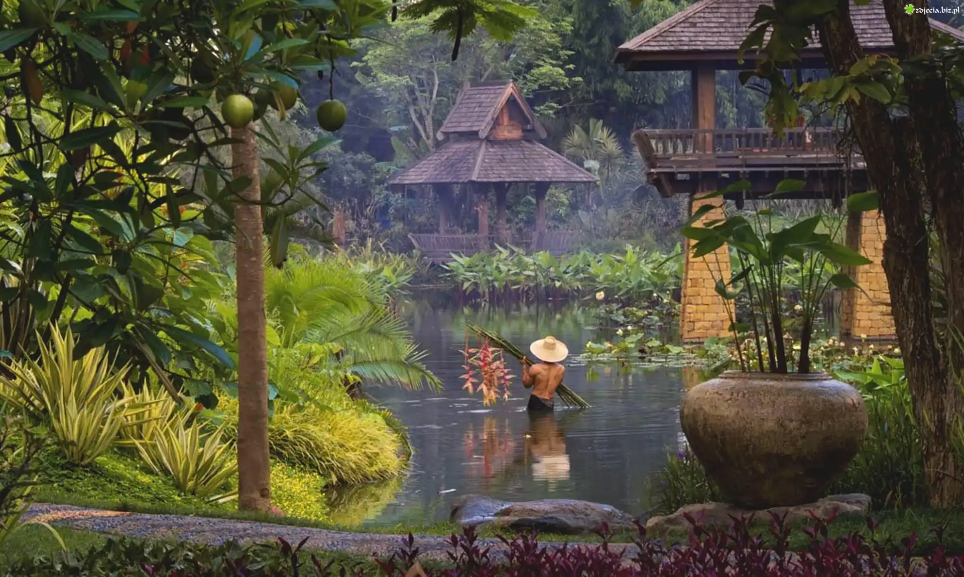 Zdjęcie Ogród, Altana, Drzewa, Kwiaty, Staw, Mężczyzna