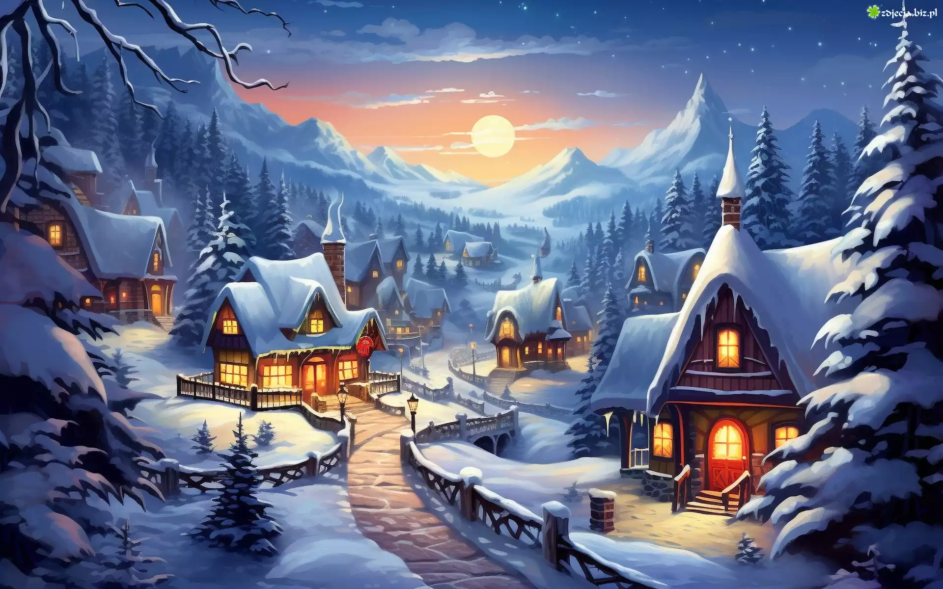 Zdjęcie Grafika, Zima, Domy, Ośnieżone, Drzewa, Góry, Droga, Ogrodzenie