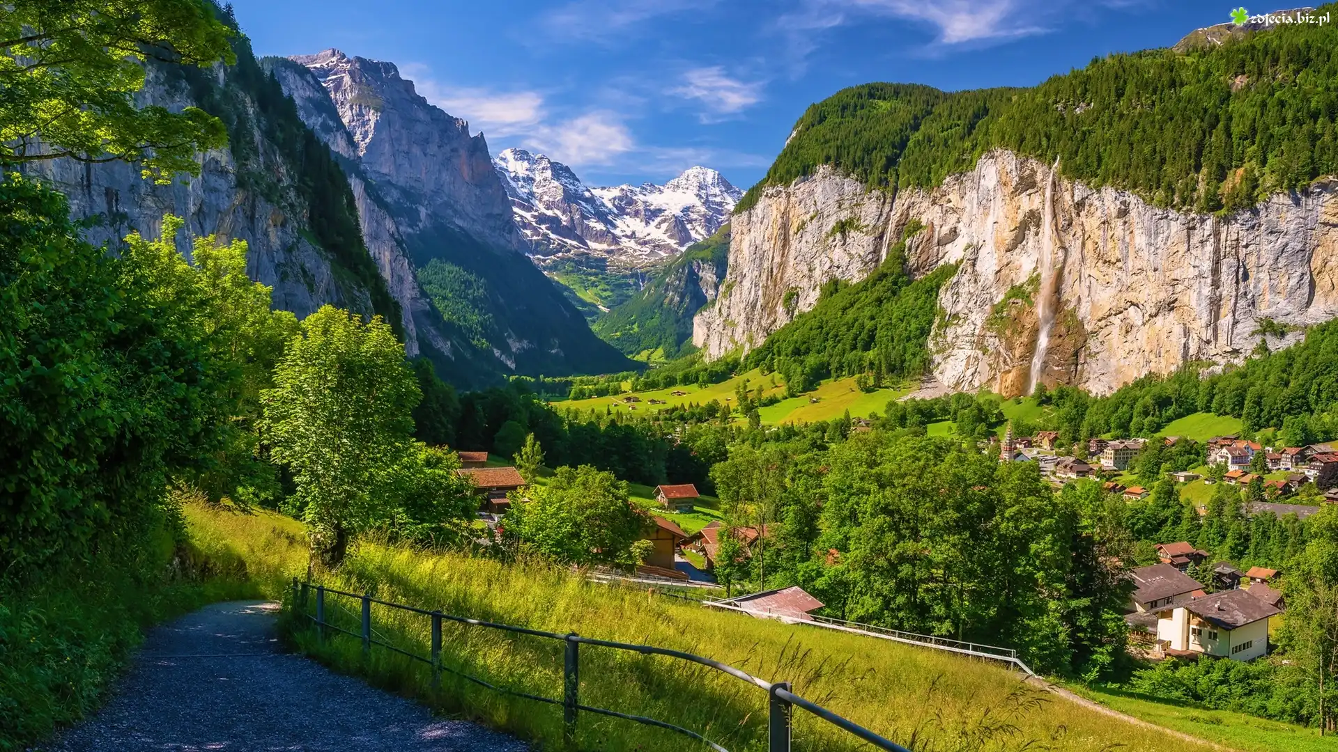 Zdjęcie Góry, Alpy Berneńskie, Droga, Drzewa, Ogrodzenie, Dolina, Domy, Lauterbrunnen, Kanton Berno, Szwajcaria |