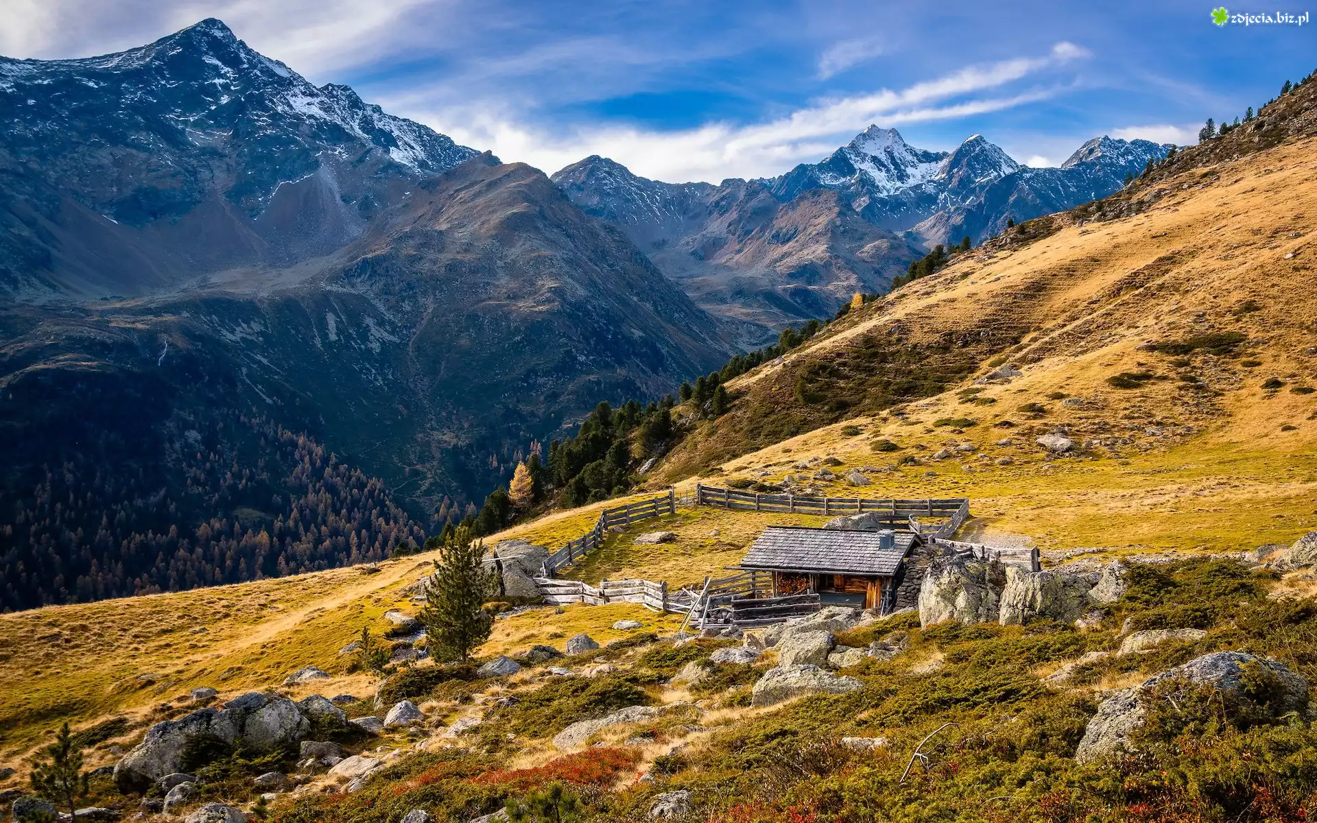 Zdjęcie Austria, Tyrol, Karyntia, Góry, Alpy, Jesień, Chata, Ogrodzenie