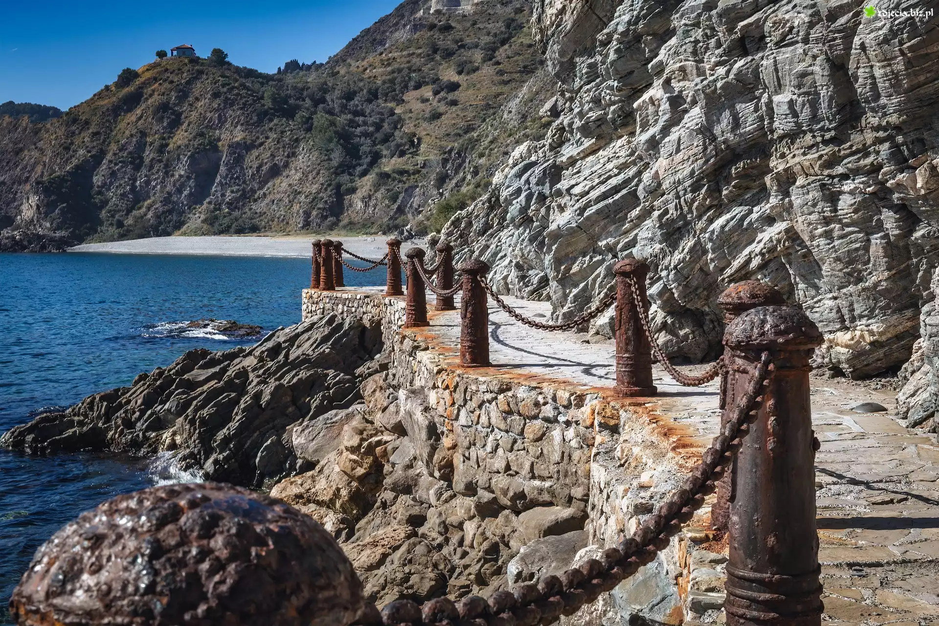 Zdjęcie Ogrodzenie, Skały, Góry, Morze, Ścieżka