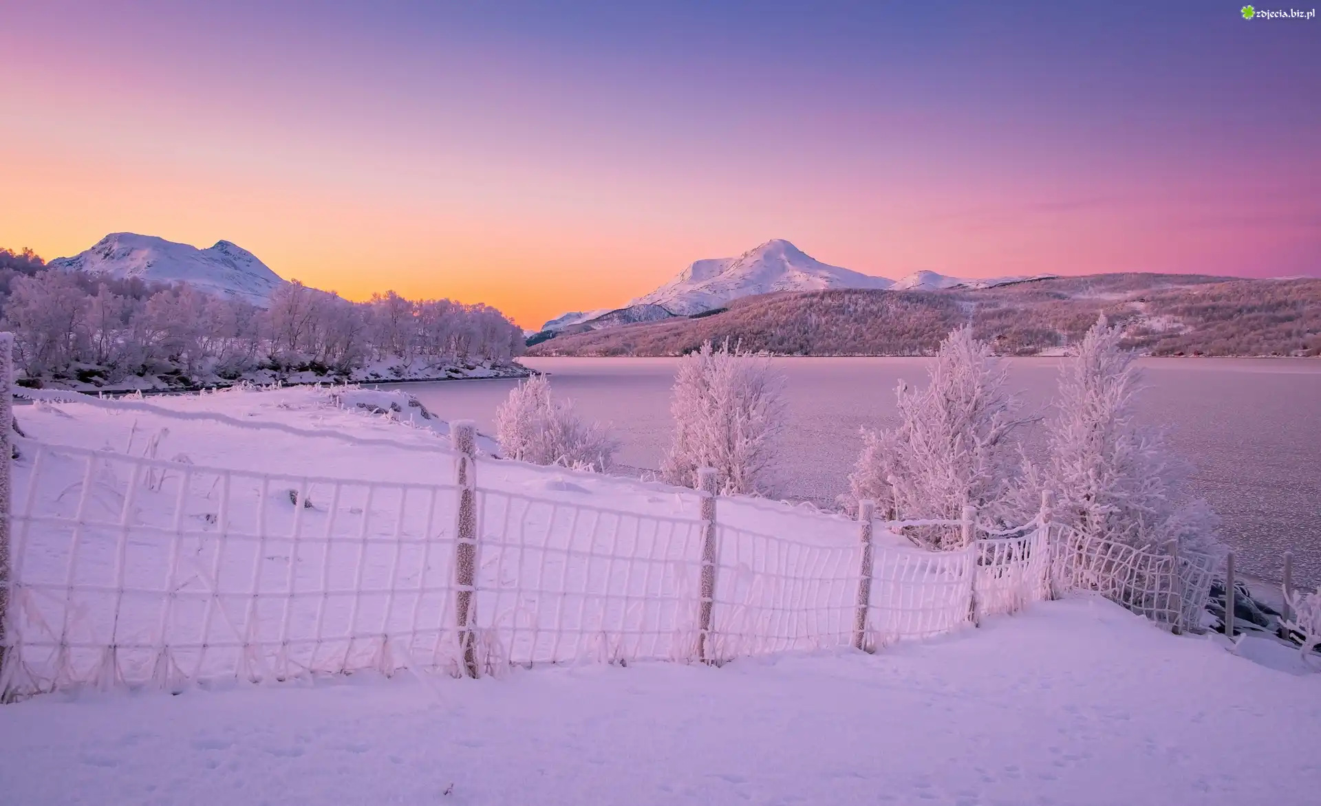Zdjęcie Zima, Śnieg, Zachód, Słońca, Góry, Jezioro, Oszronione, Drzewa, Ogrodzenie