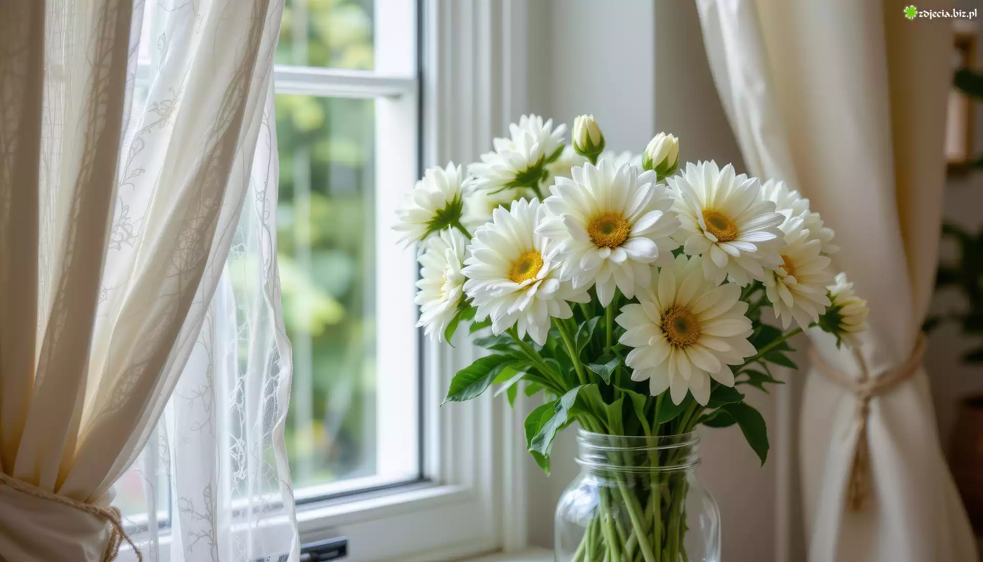 Zdjęcie Białe, Chryzantemy, Słoik, Okno