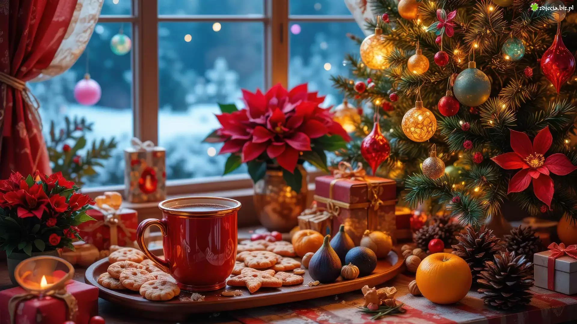 Zdjęcie Boże Narodzenie, Choinka, Ciasteczka, Kubek, Kawa, Prezenty, Okno