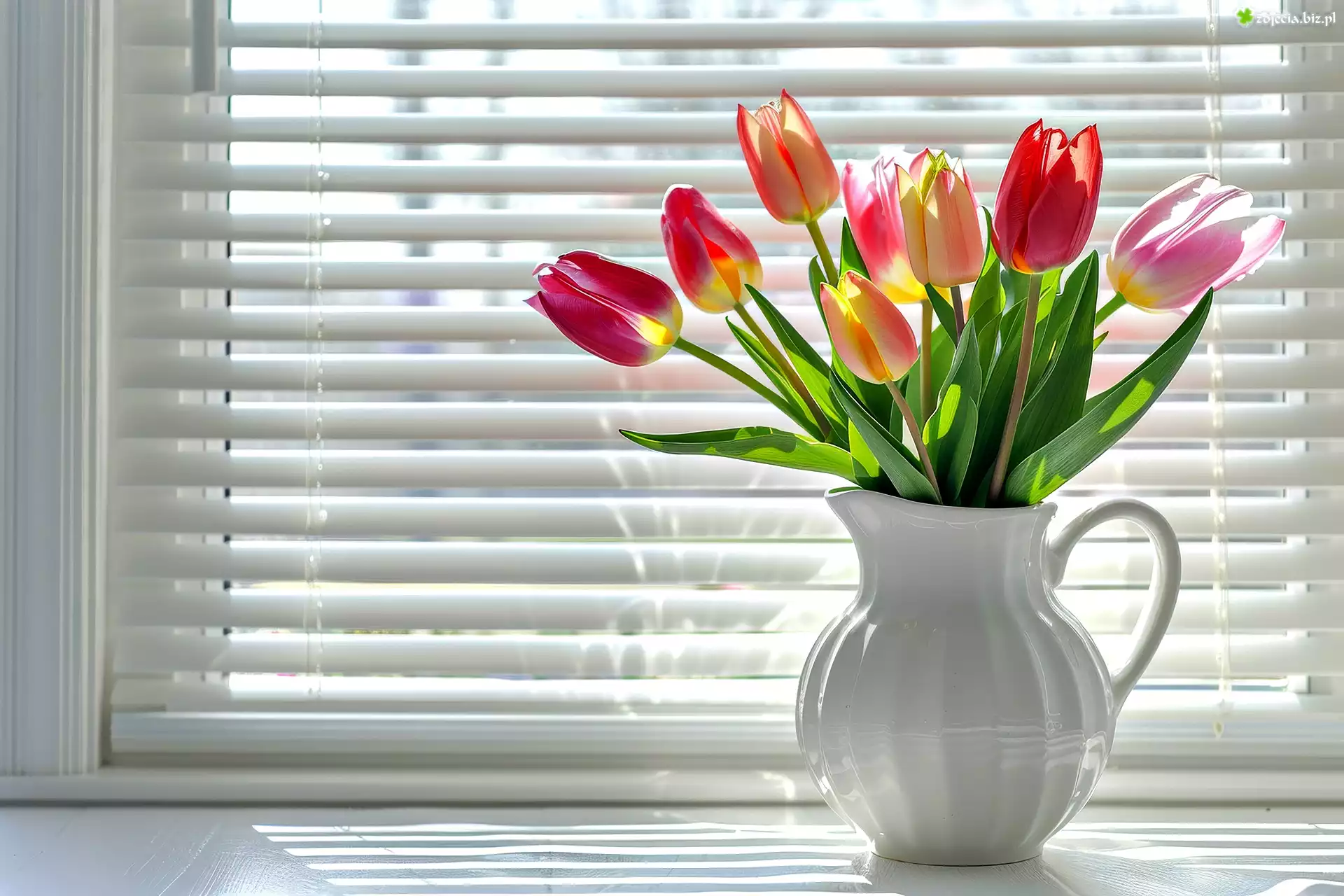 Zdjęcie Tulipany, Bukiet, Dzbanek, Okno, Żaluzja, Grafika