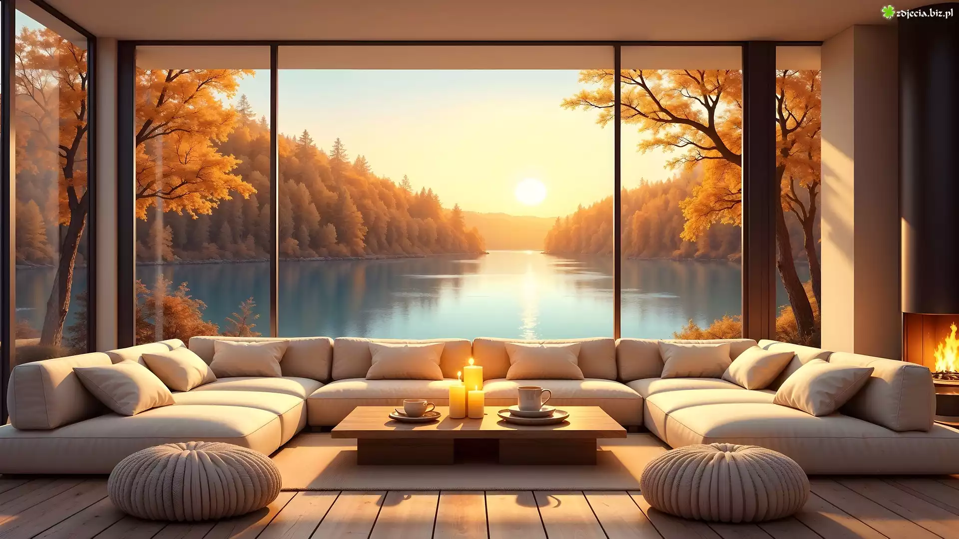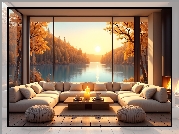 Zdjęcie Jesień, Jezioro, Drzewa, Okno, Pokój, Kanapa