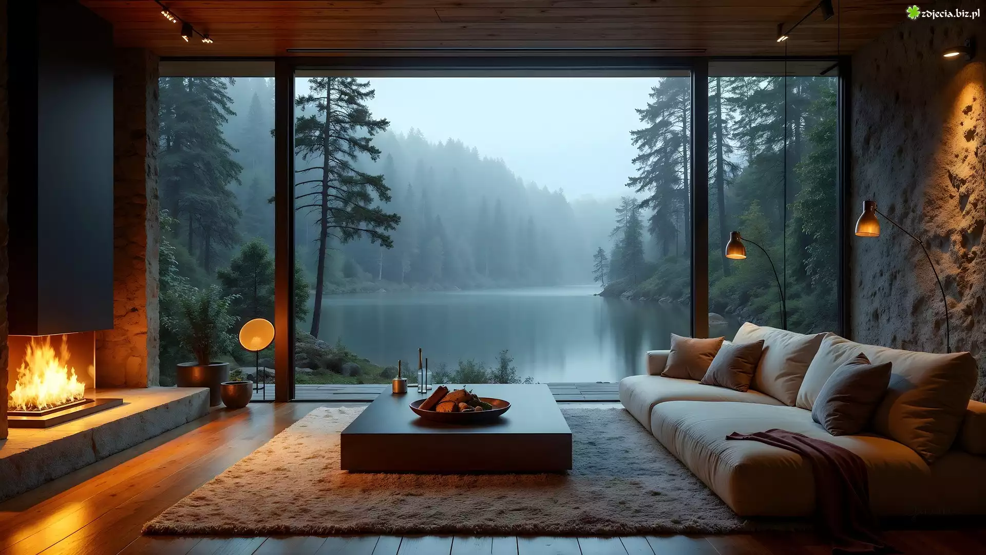 Zdjęcie Salon, Kominek, Kanapa, Okno, Widok, Rzeka, Las