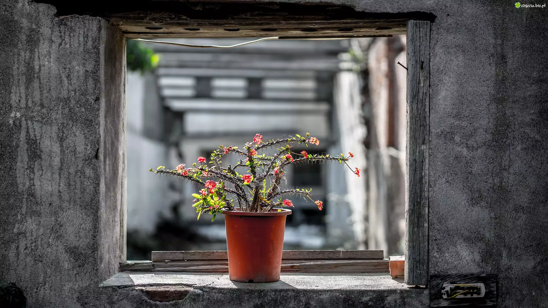 Zdjęcie Okno, Kwiat, Kolce, Doniczka