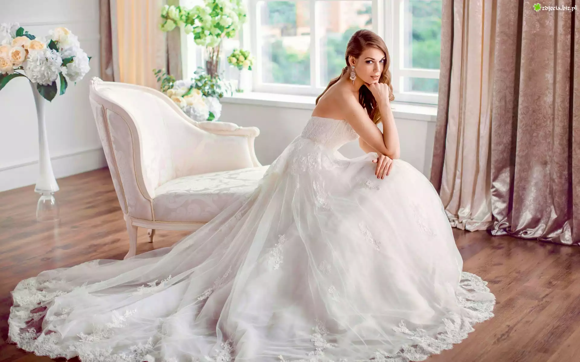 Zdjęcie Kobieta, Panna młoda, Suknia, Biała, Ślub, Pokój, Okno