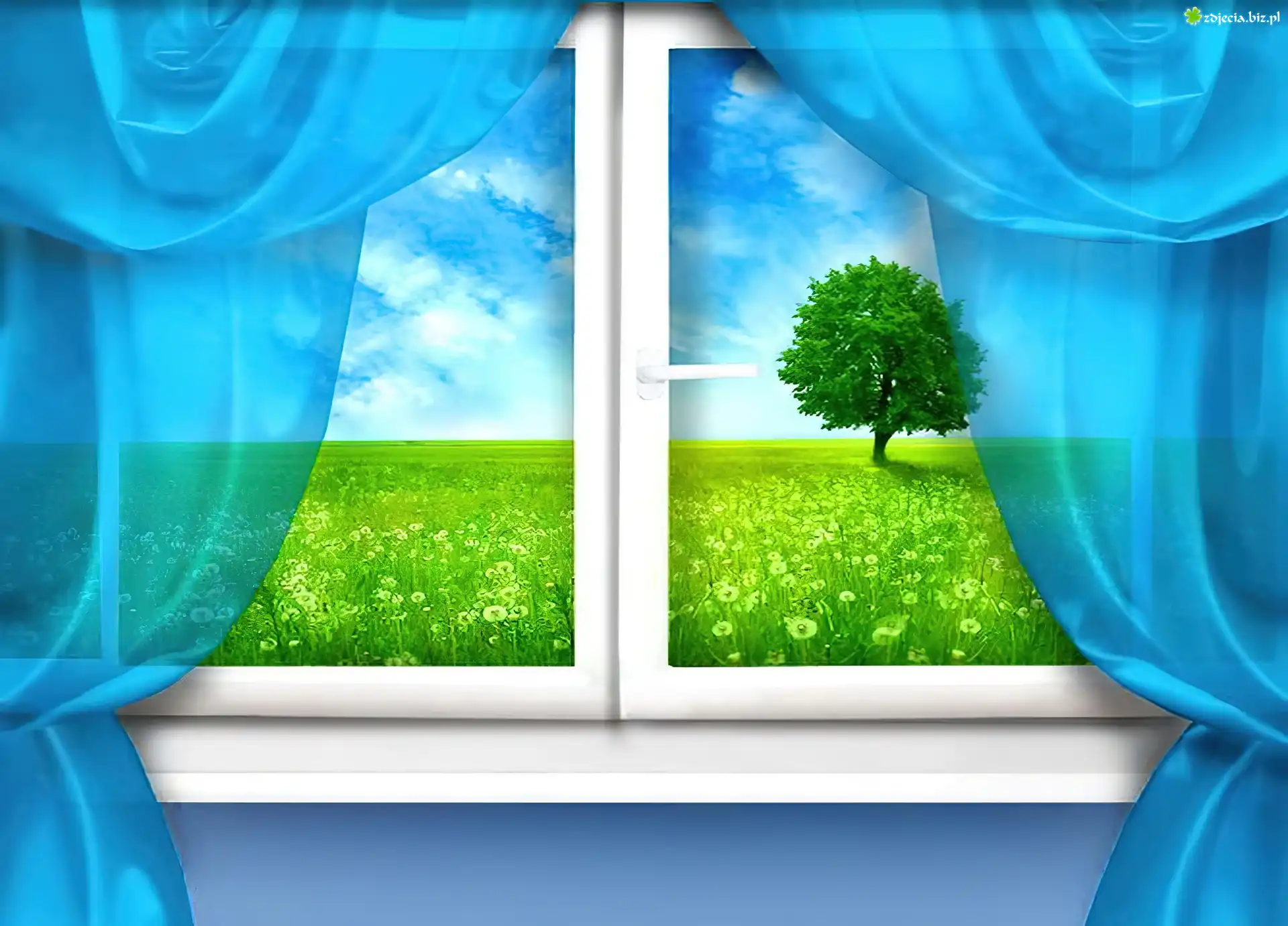 Zdjęcie Okno, Łąka, Drzewo, Niebieskie, Zasłony