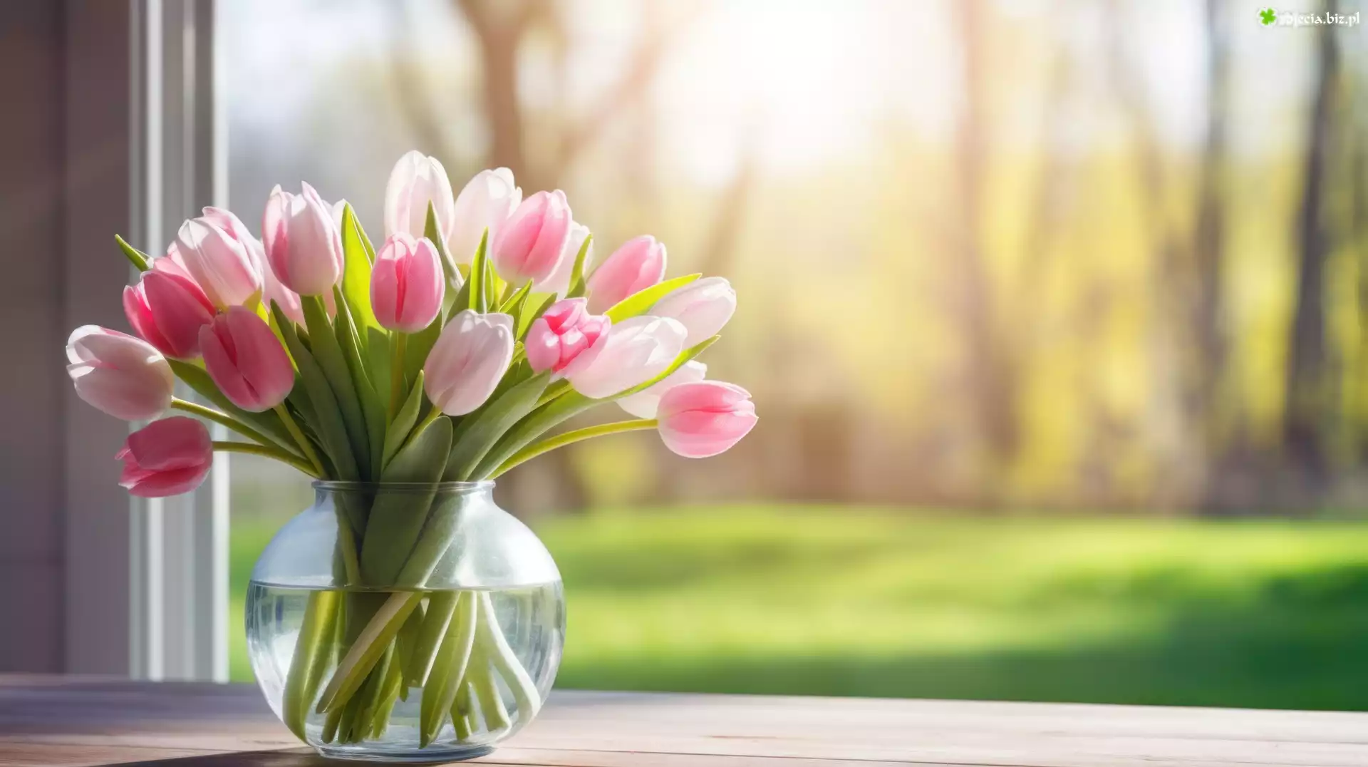 Zdjęcie Różowe, Tulipany, Bukiet, Okno