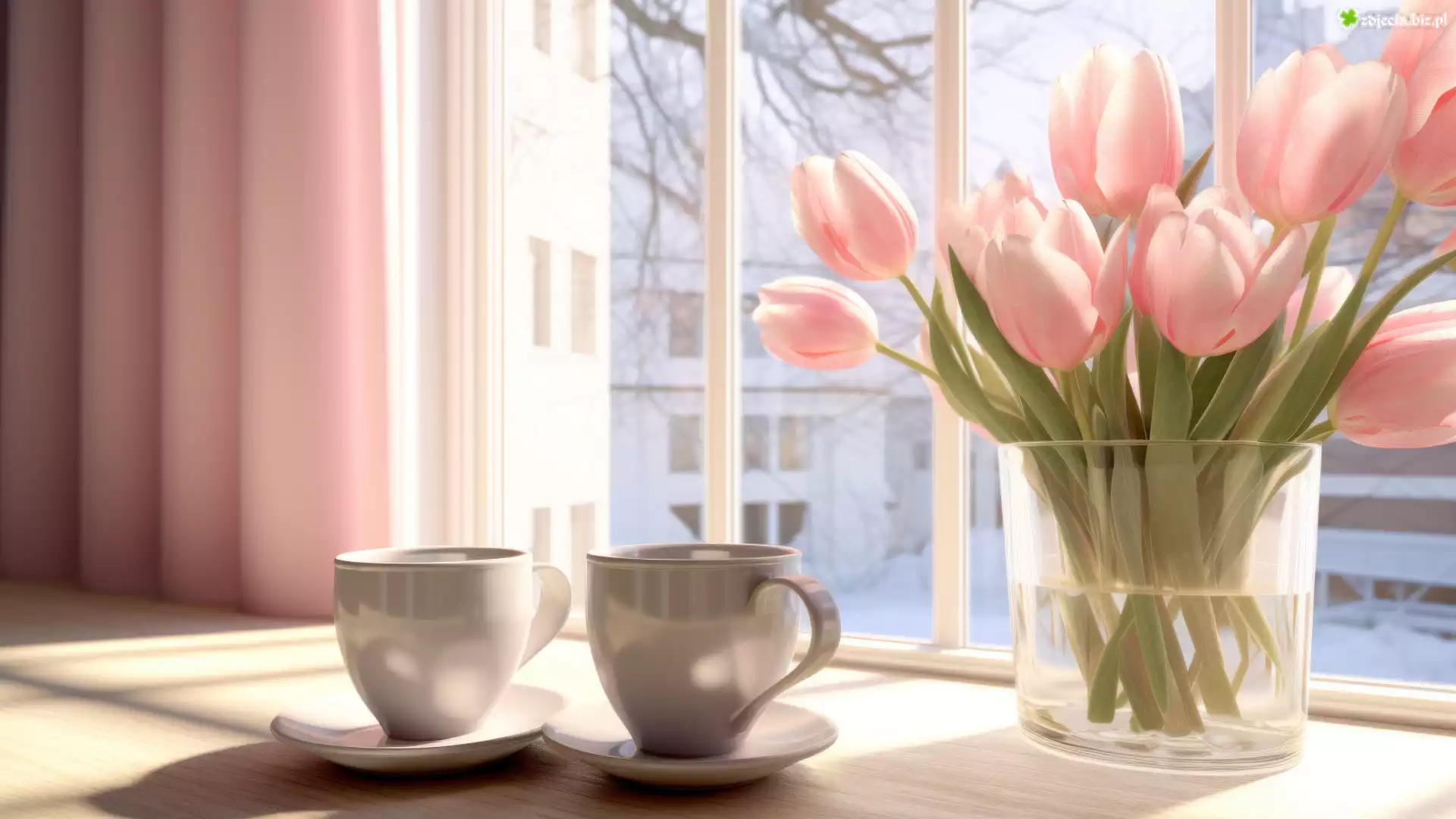 Zdjęcie Kwiaty, Różowe, Tulipany, Wazon, Dwie, Filiżanki, Parapet, Okno