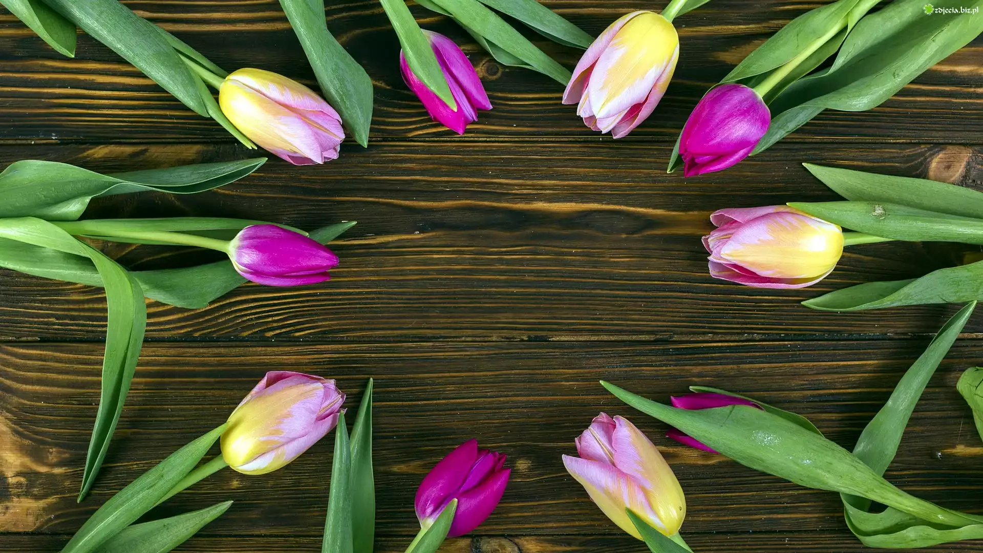 Zdjęcie Okrąg, Kolorowe, Tulipany, Brązowe, Deski