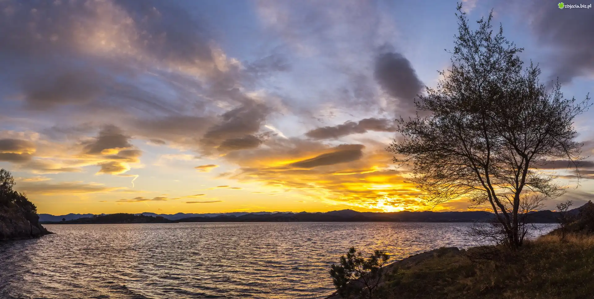 Zdjęcie Norwegia, Okręg Rogaland, Jezioro, Zachód słońca, Drzewa, Chmury