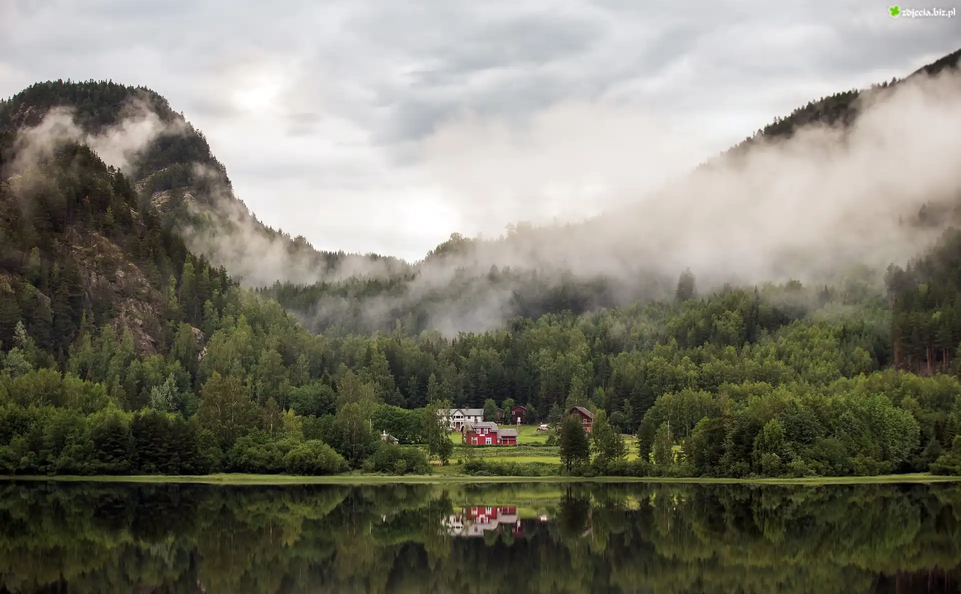 Zdjęcie Norwegia, Okręg Buskerud, Jezioro, Góry, Las, Mgła, Domy
