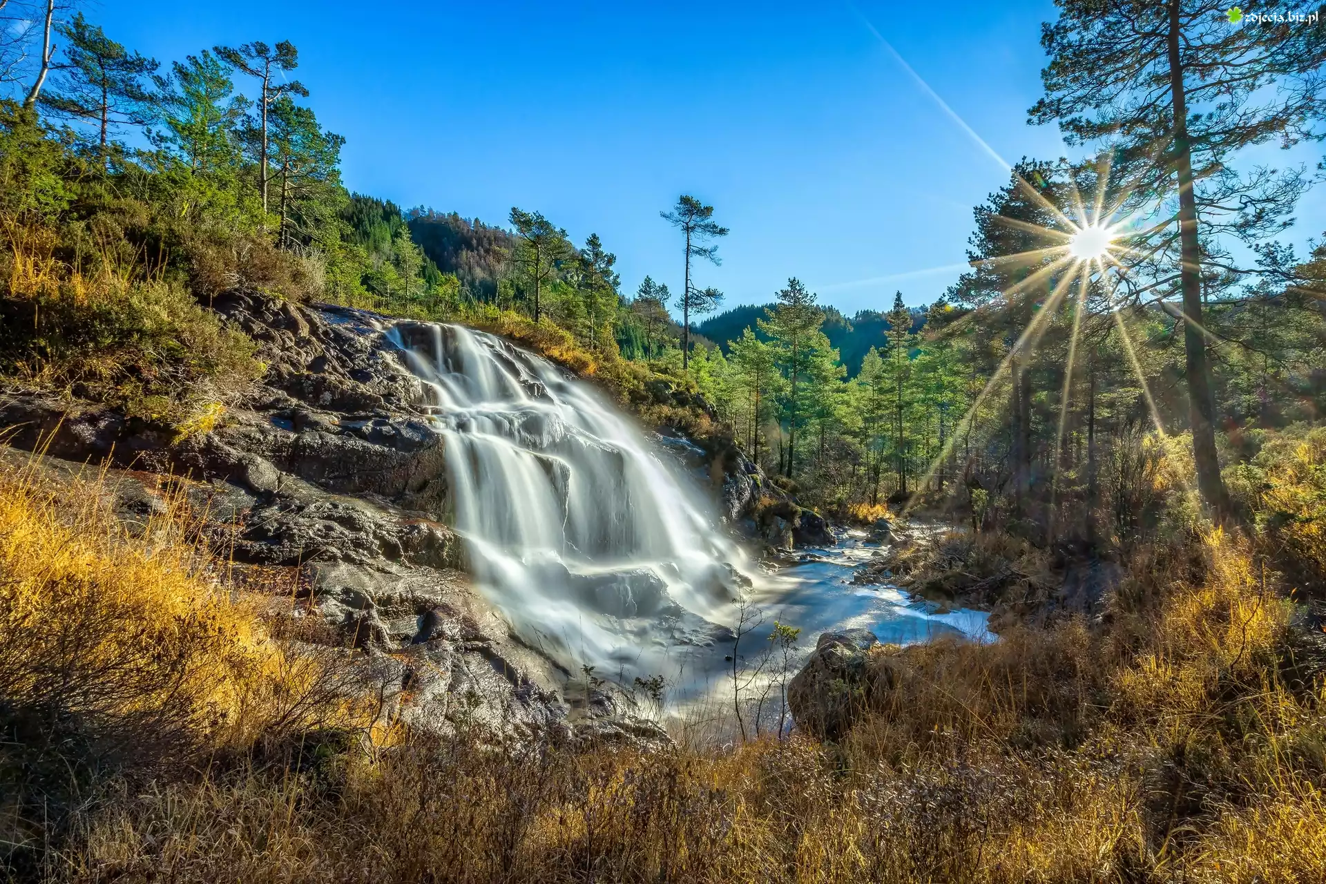 Zdjęcie, Norwegia, Okręg Rogaland, Wodospad, Las, Promienie słońca