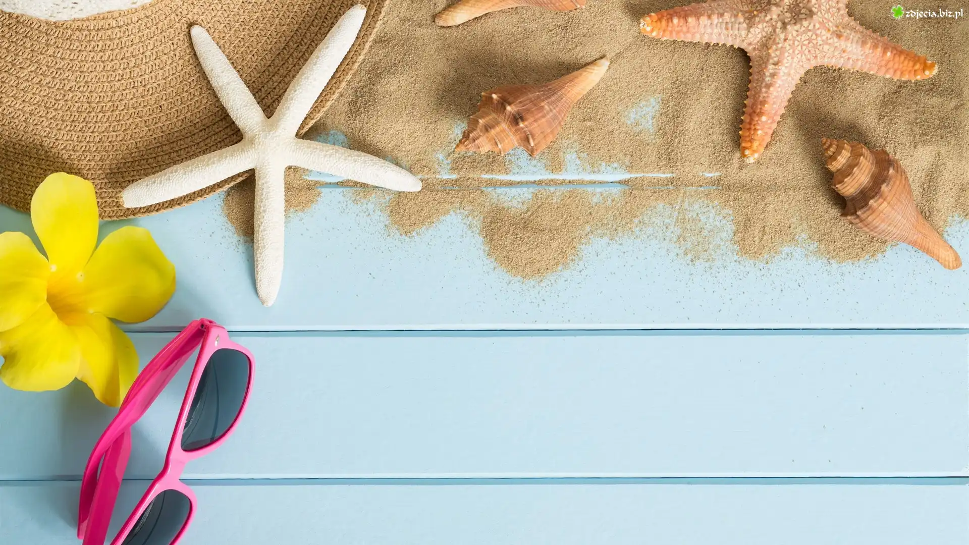 Zdjęcie Okulary, Muszelki, Rozgwiazda, Piasek, Kwiat, Deski