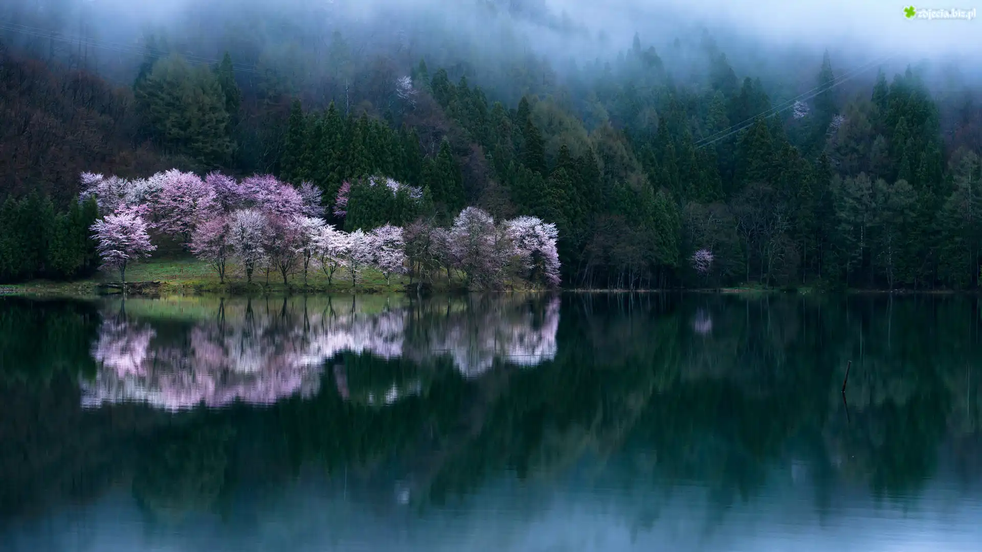Zdjęcie, Okwiecone, Drzewa, Jezioro