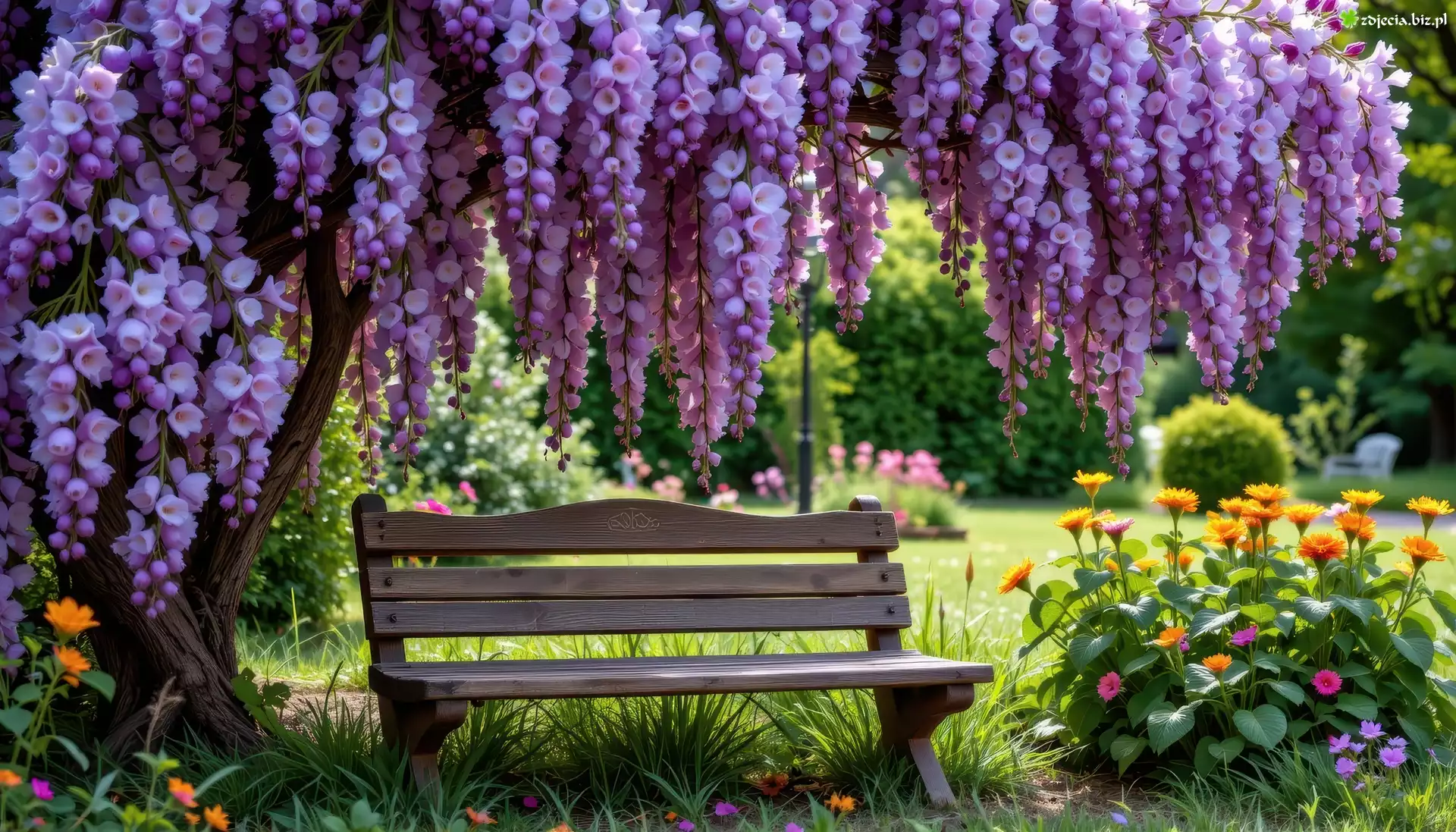 Zdjęcie Fioletowe, Kwiaty, Ławka, Okwiecone, Drzewo, Grafika AI