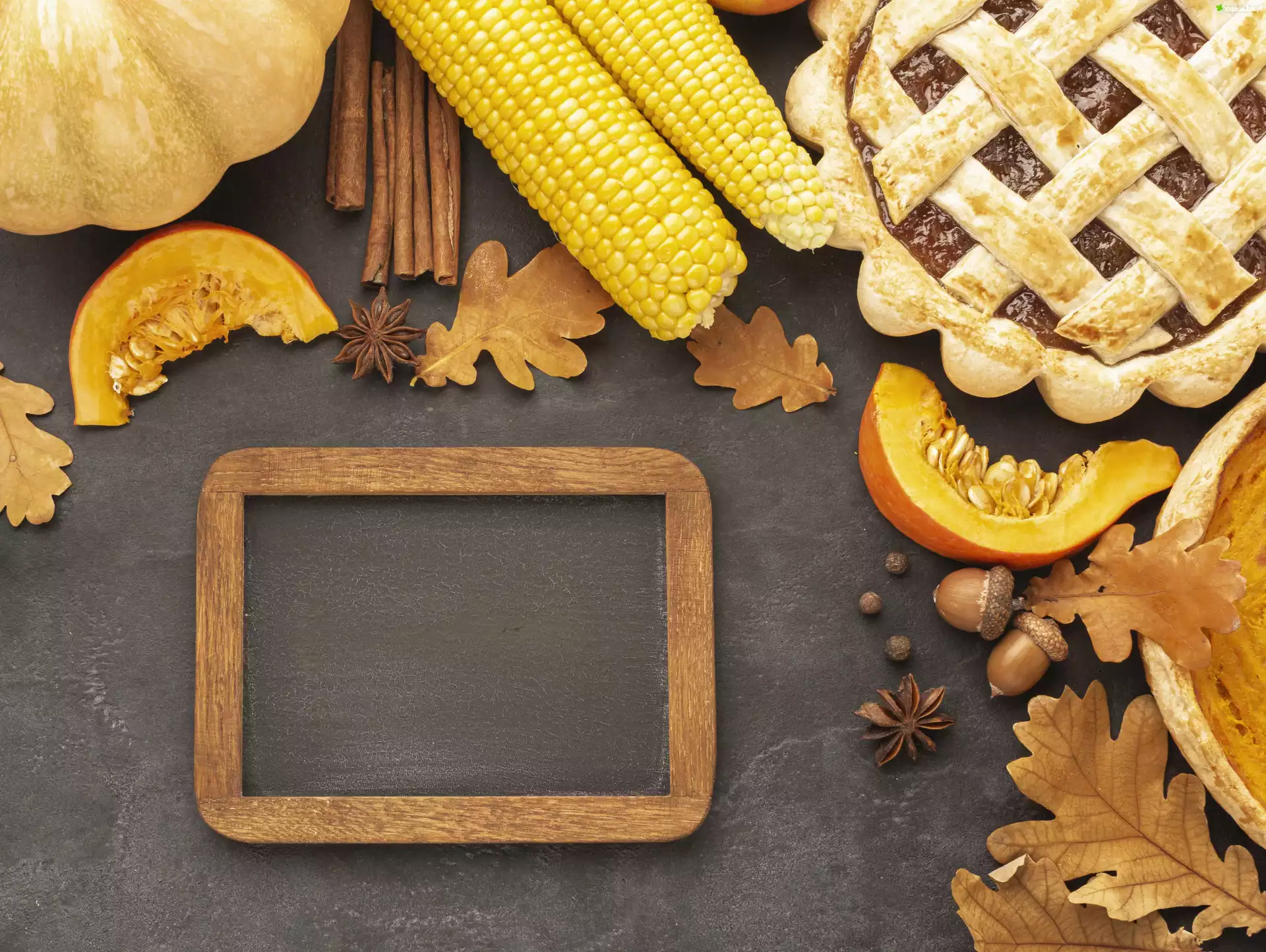 Zdjęcie Dynie, Kukurydza, Żołędzie, Liście, Ciasto, Anyż, Laski, Wanilii, Ramka, Jesienna, Kompozycja |