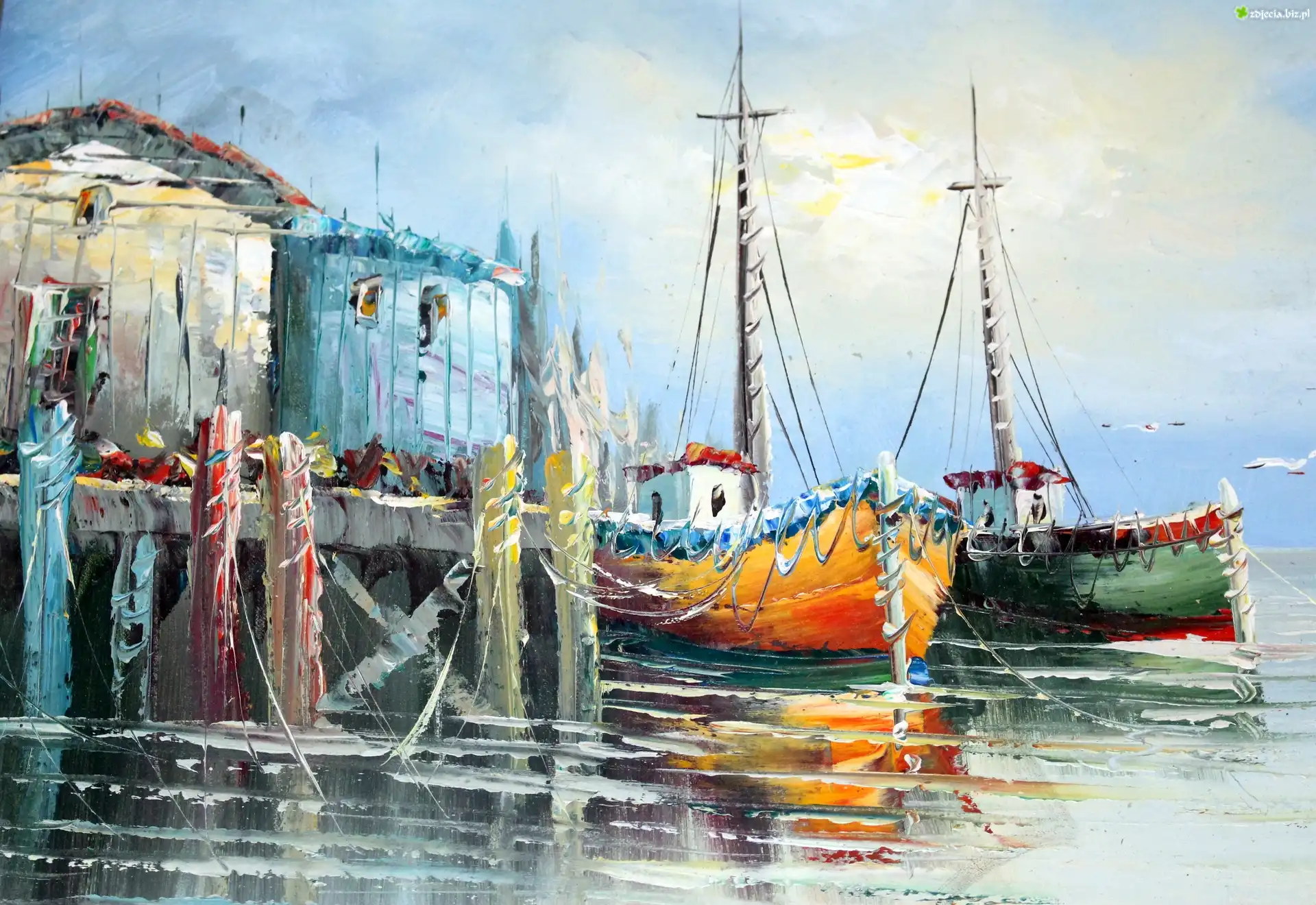 Zdjęcie Obraz, Olejny, Marynistyka, Nabrzeże, Portowe, Morze, Kutry