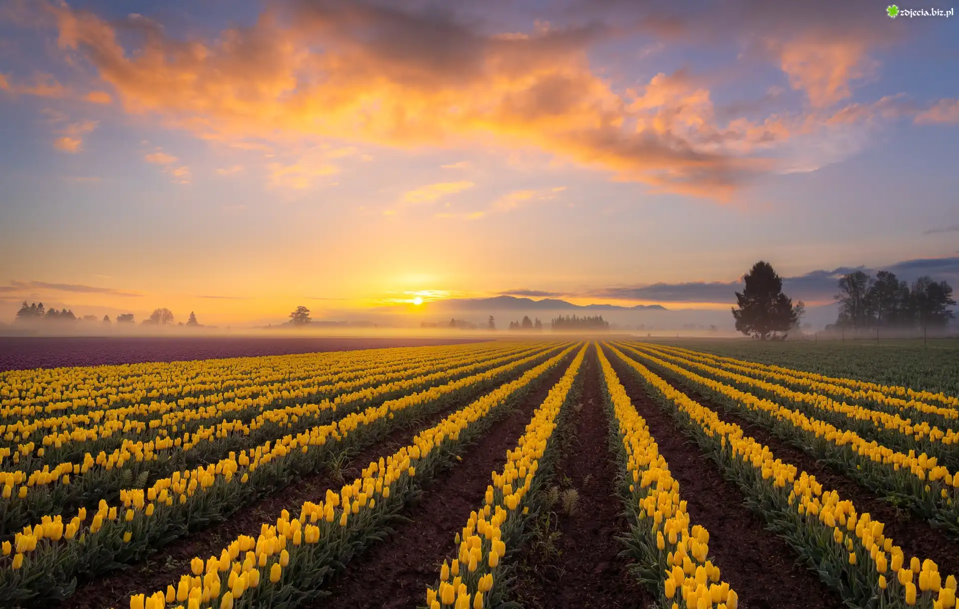Zdjęcie, Tulipany, Żółte, Plantacja, Wschód słońca, Mgła, Drzewa, Chmury