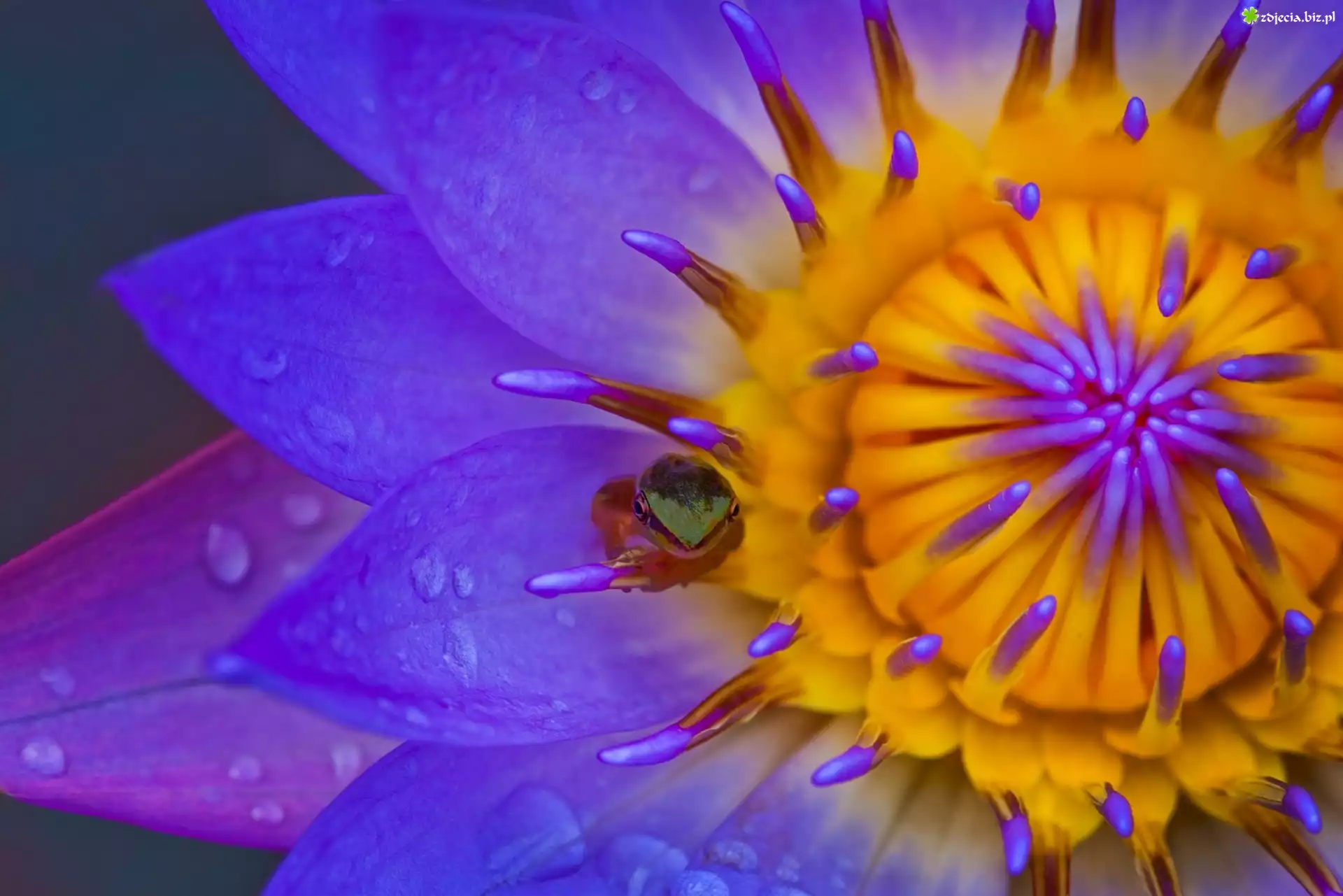 Zdjęcie Żółto, Fioletowy, Kwiat, Żabka, Krople, Makro