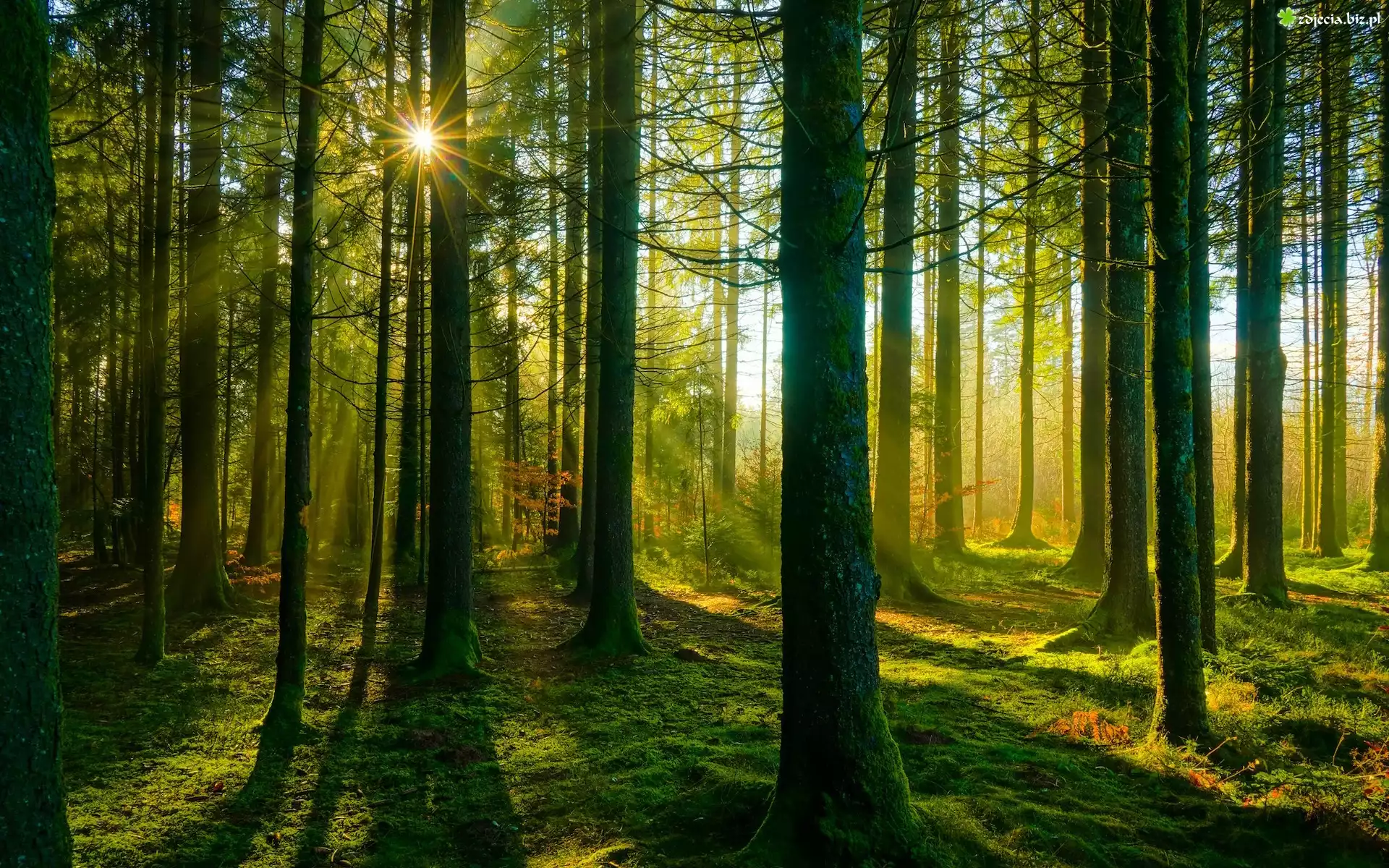 Zdjęcie Las, Omszałe, Drzewa, Promienie słońca
