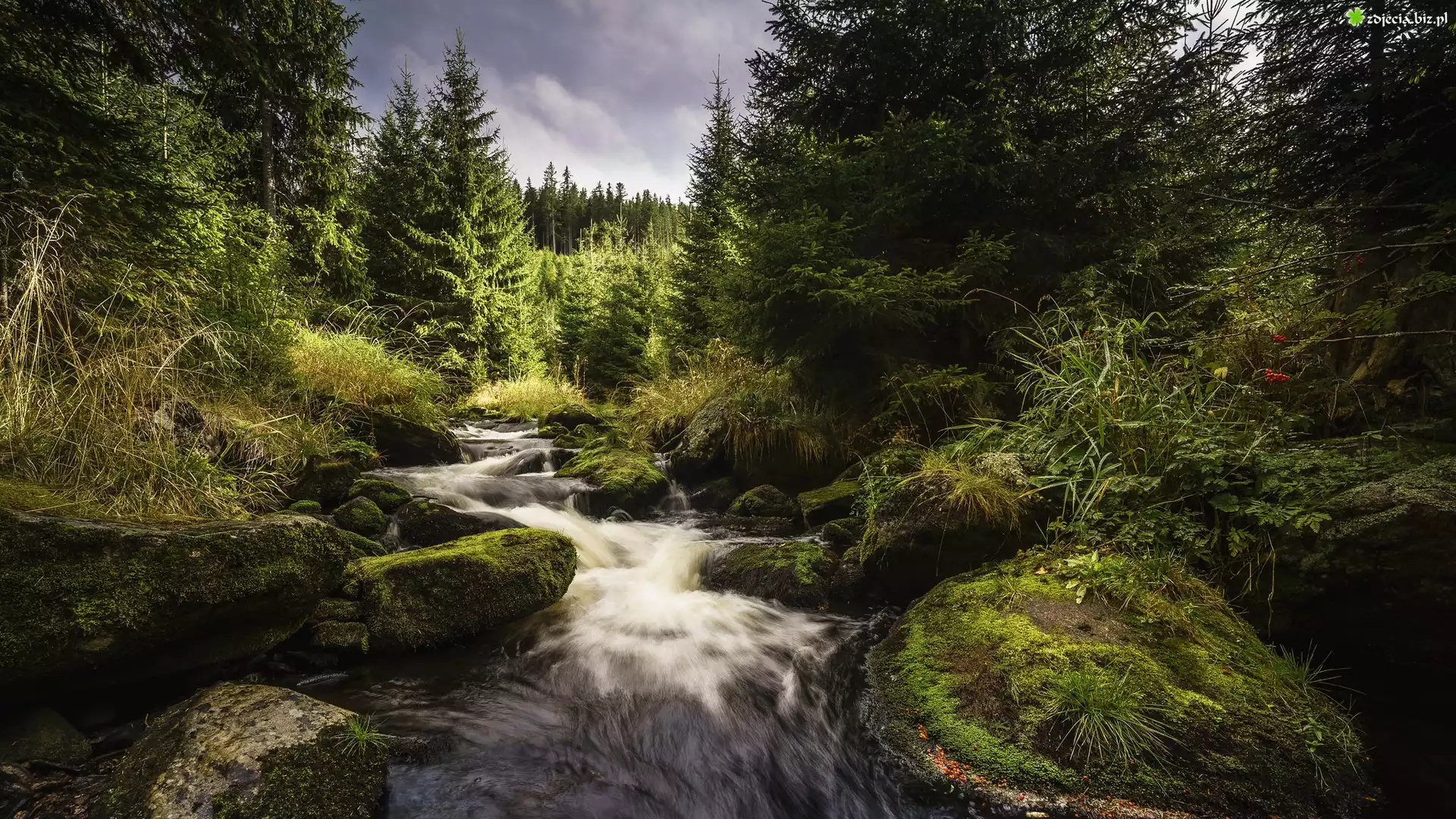Zdjęcie Rzeka, Omszałe, Kamienie, Drzewa, Rośliny