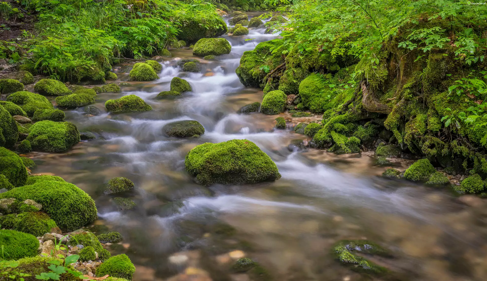 Zdjęcie Rzeka, Omszałe, Kamienie, Zielone, Rośliny