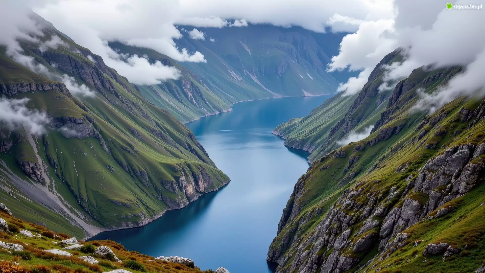 Zdjęcie Góry, Opadające, Chmury, Fiord, AI