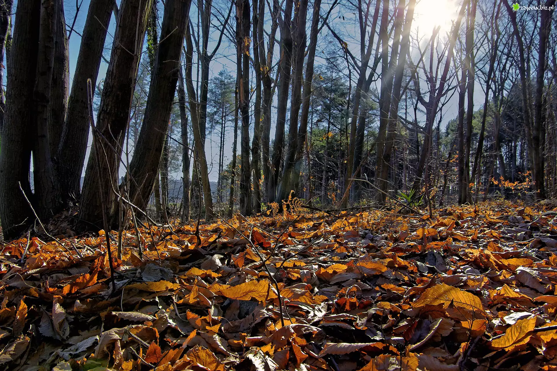 Zdjęcie Jesień, Las, Drzewa, Opadłe, Liście, Słońce
